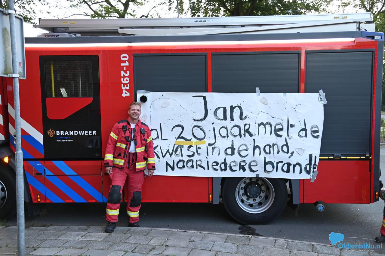 Met een uitzicht over het dorp werd Jan in de kerktoren gefeliciteerd met zijn dienstjaren. Bij de terugreis naar de kazerne werd een groot spandoek aan de tankautospuit bevestigd met de tekst: “Jan al 20 jaar met de kwast in de hand, naar iedere brand!” Dit was een verwijzing naar zijn dubbele rol als vrijwillige brandweerman en als schilder met zijn eigen bedrijf, Börchers Schilder- en Restauratiewerken.