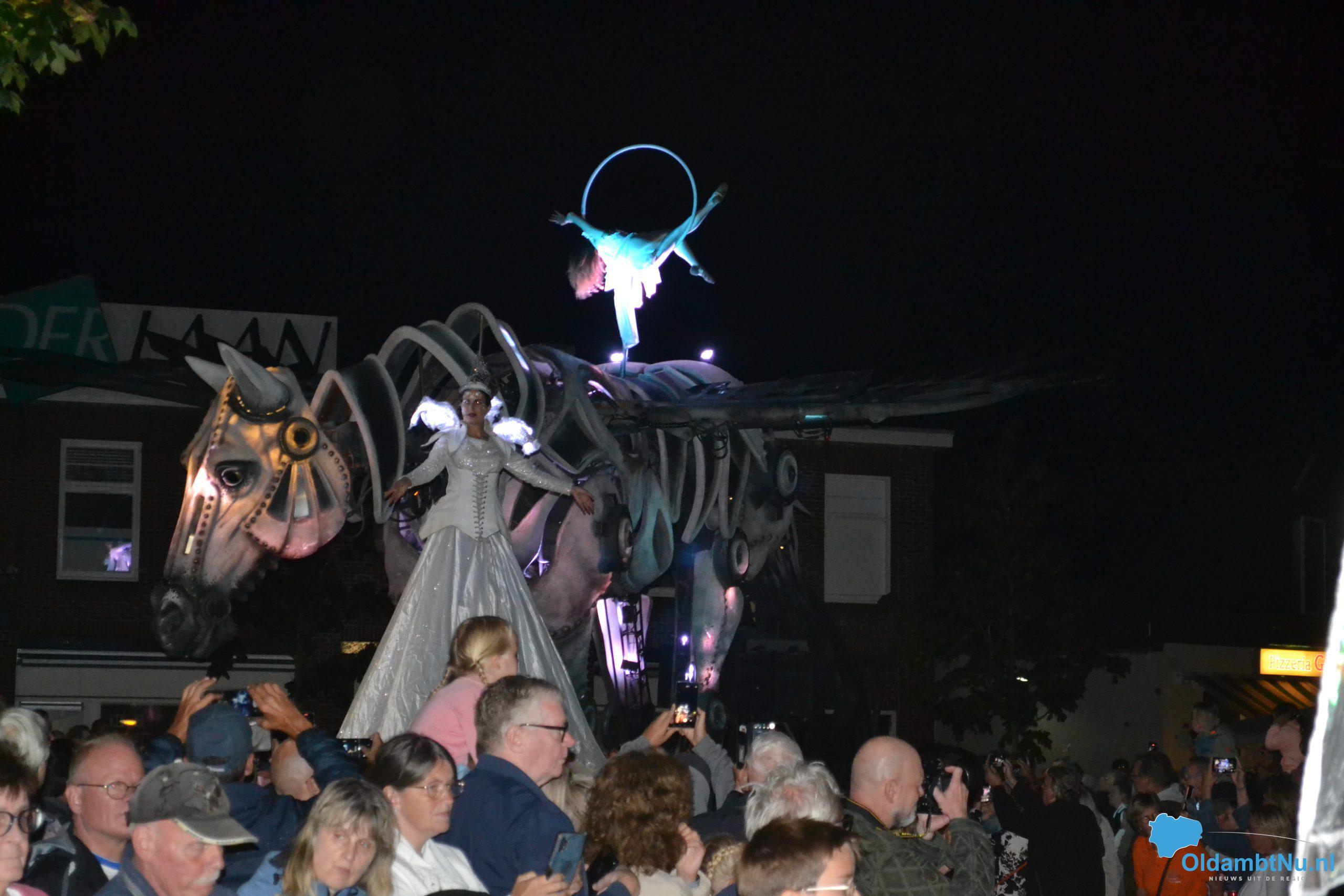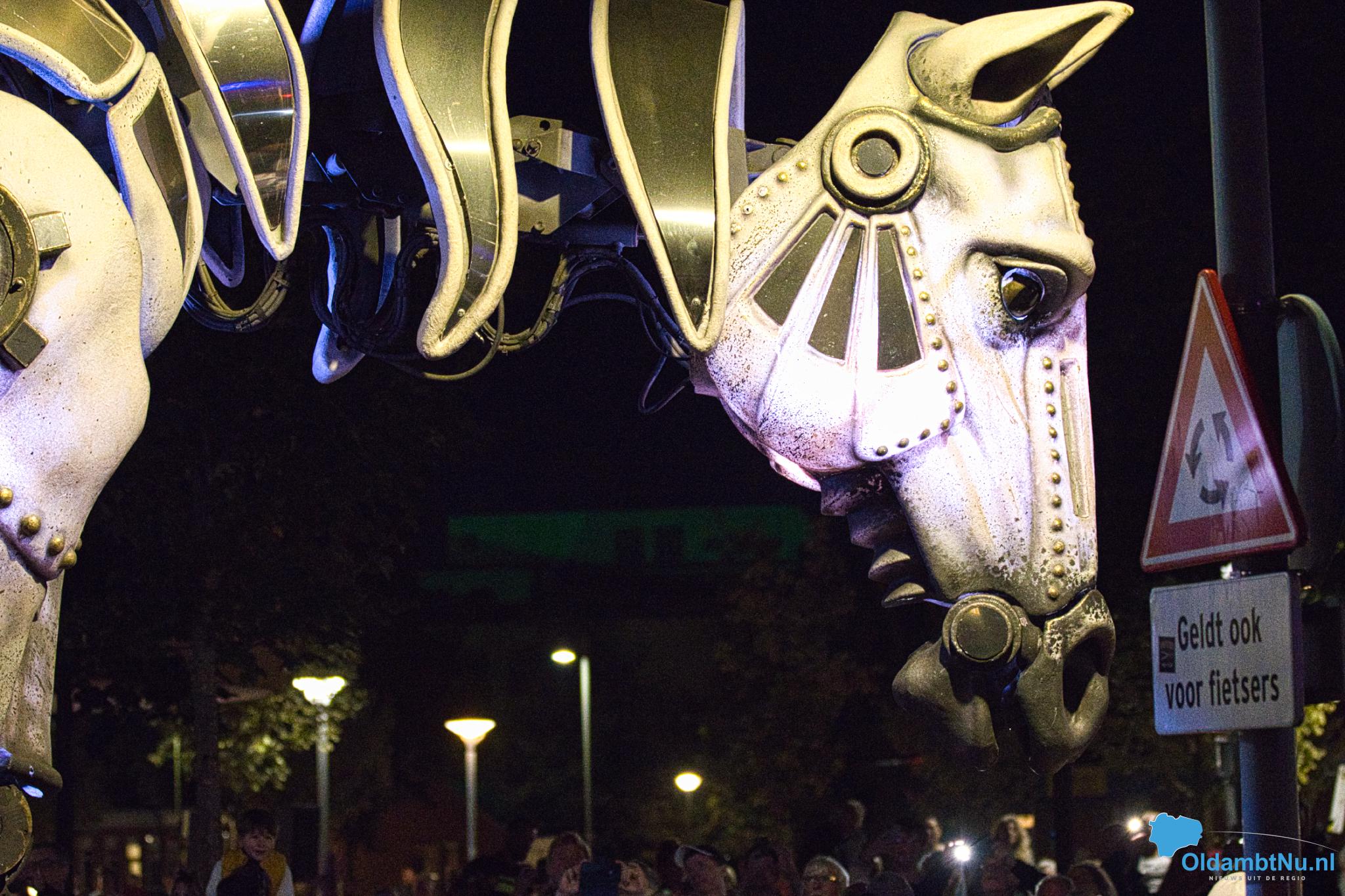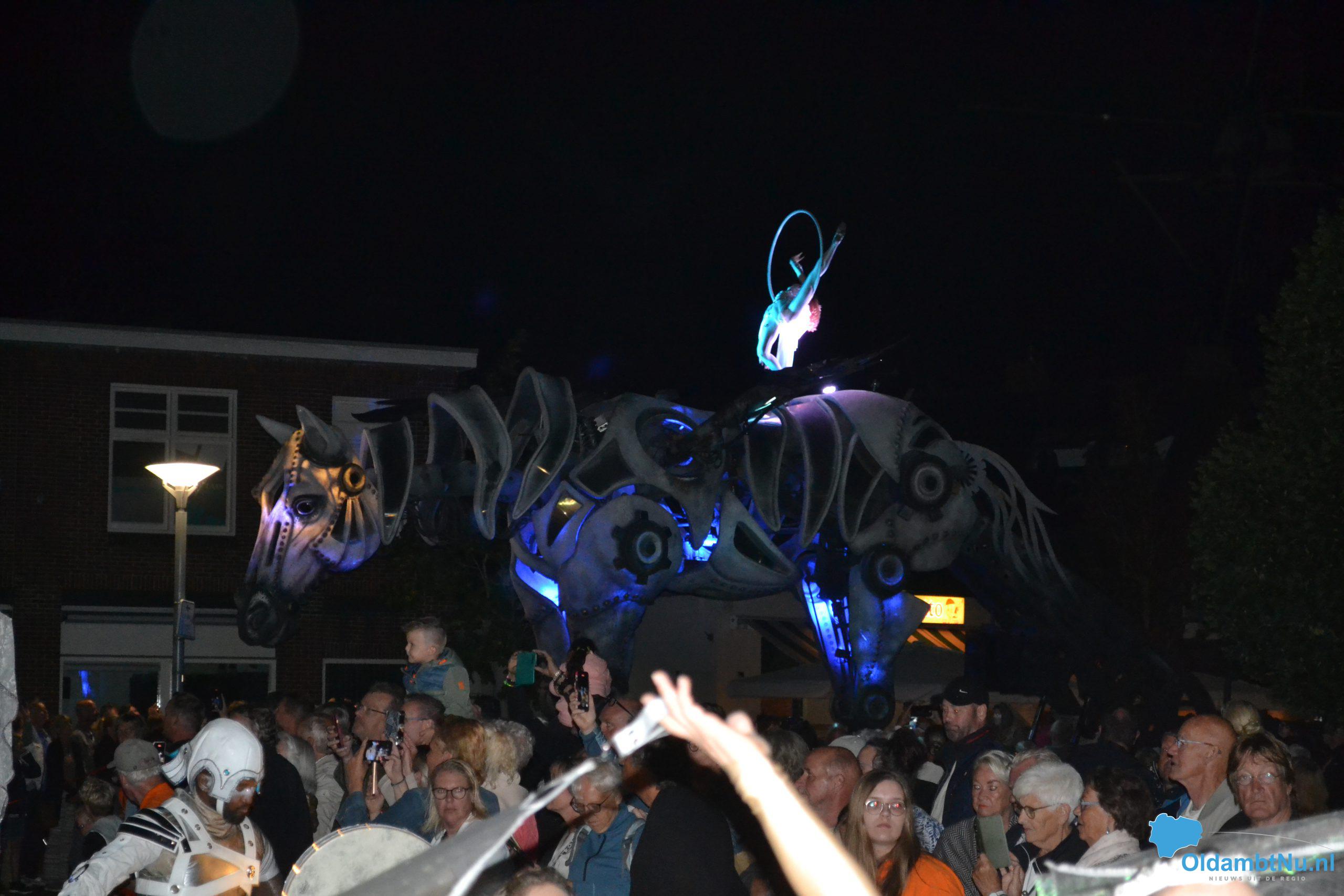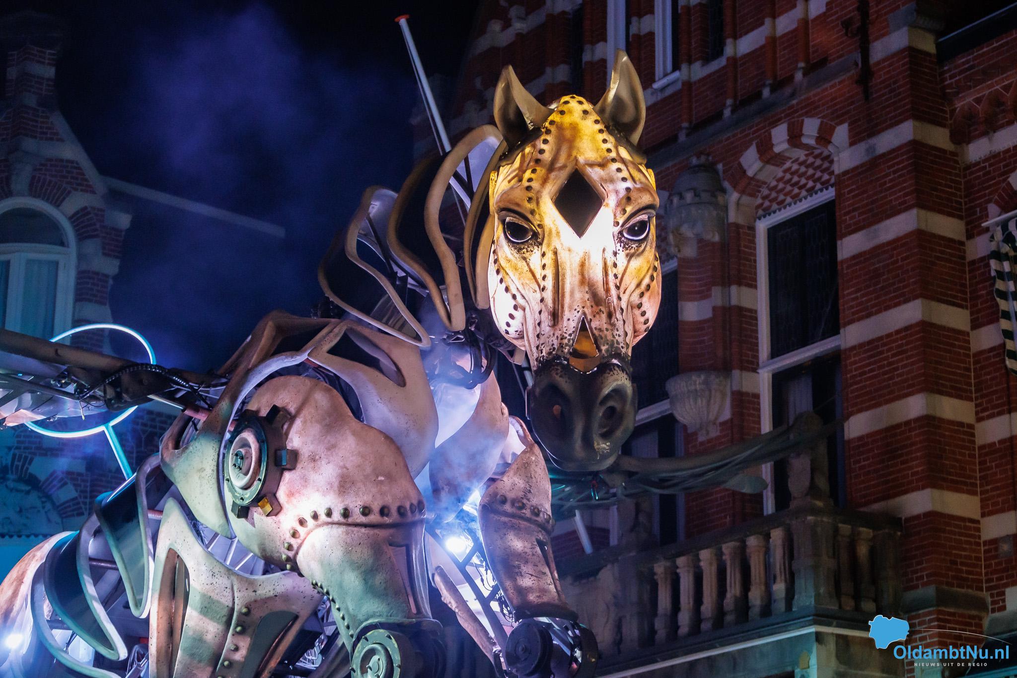 Het reusachtige paard maakte een indrukwekkende tocht via de Langestraat, over het Burgemeester Schönfeldplein, en eindigde op het Marktplein, waar een spectaculaire slotact werd uitgevoerd. De avond werd feestelijk afgesloten met een optreden van de coverband Nughter.