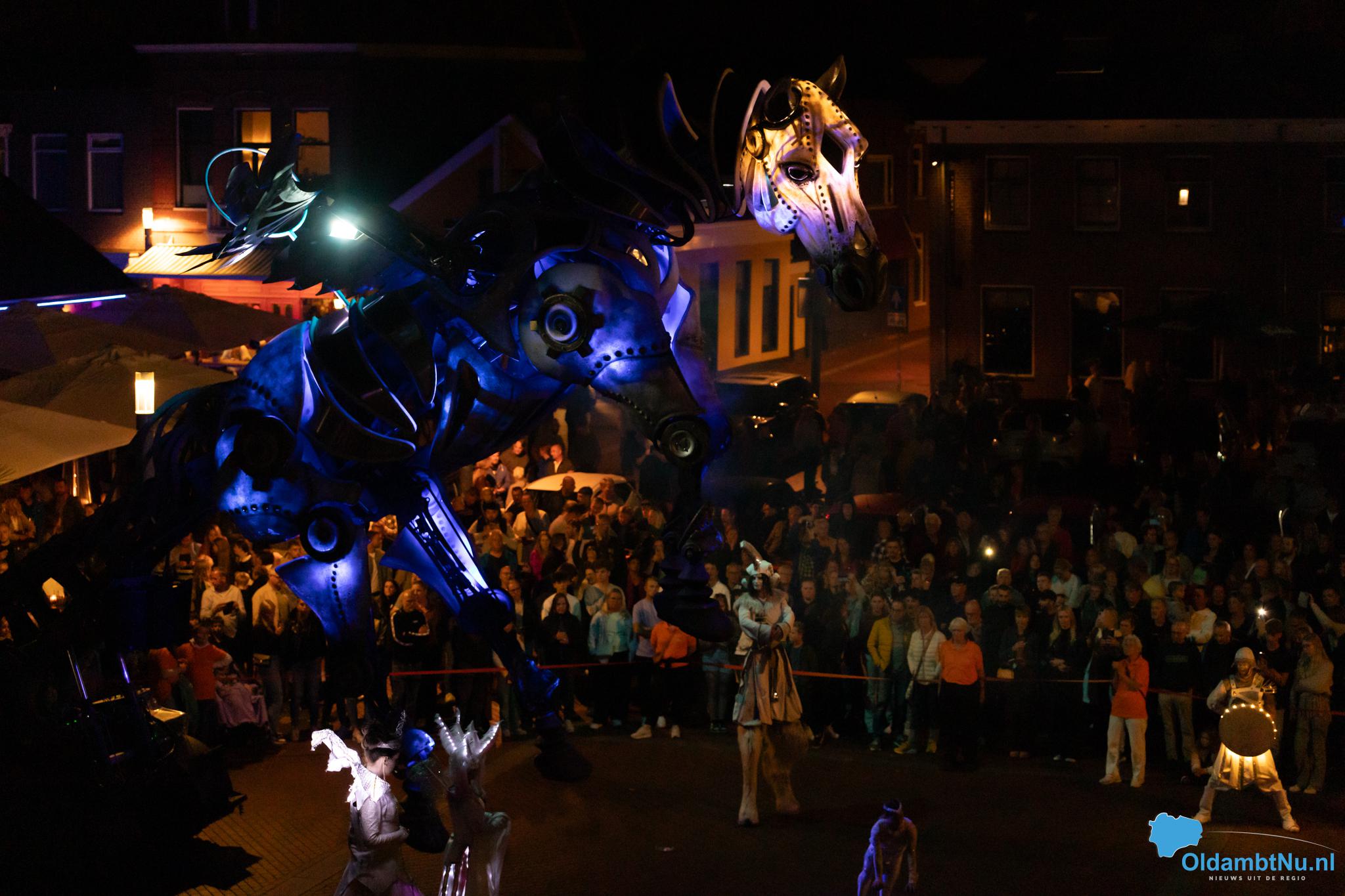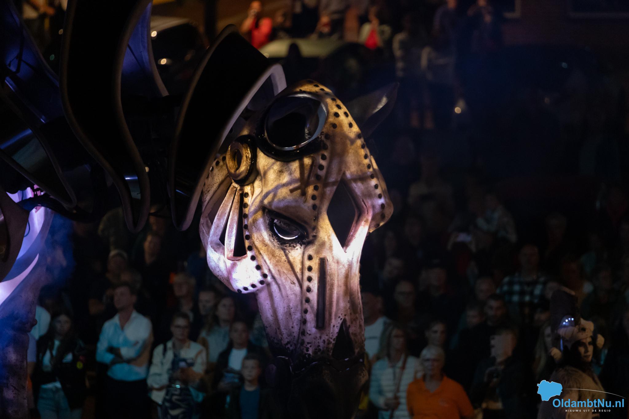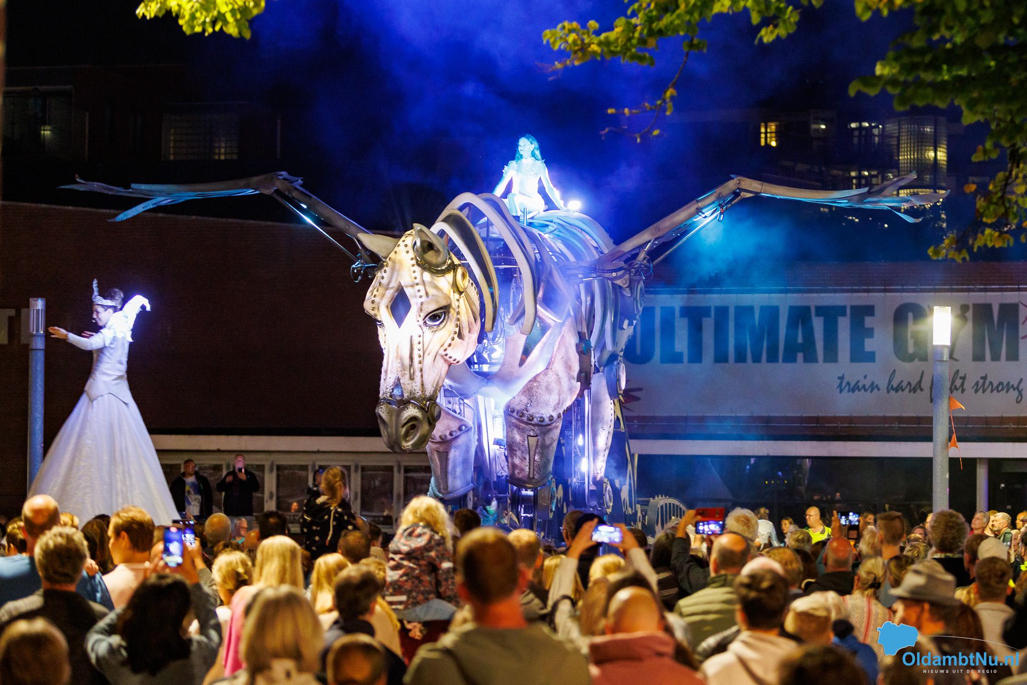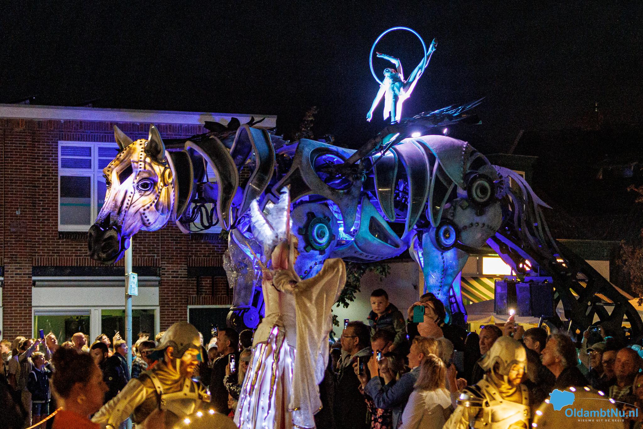 Het reusachtige paard maakte een indrukwekkende tocht via de Langestraat, over het Burgemeester Schönfeldplein, en eindigde op het Marktplein, waar een spectaculaire slotact werd uitgevoerd. De avond werd feestelijk afgesloten met een optreden van de coverband Nughter.