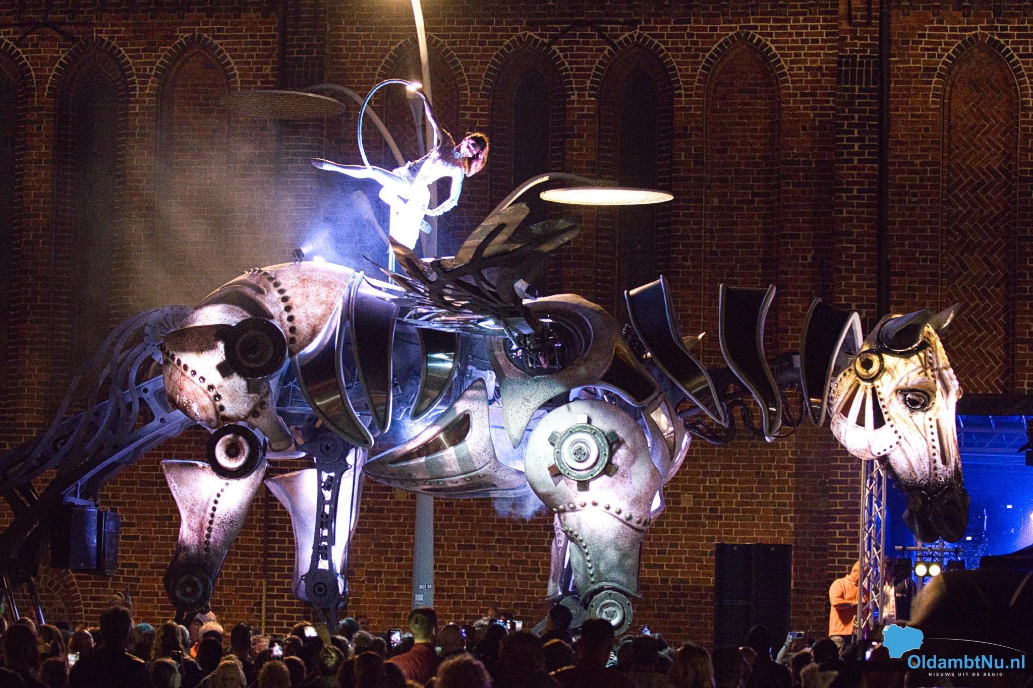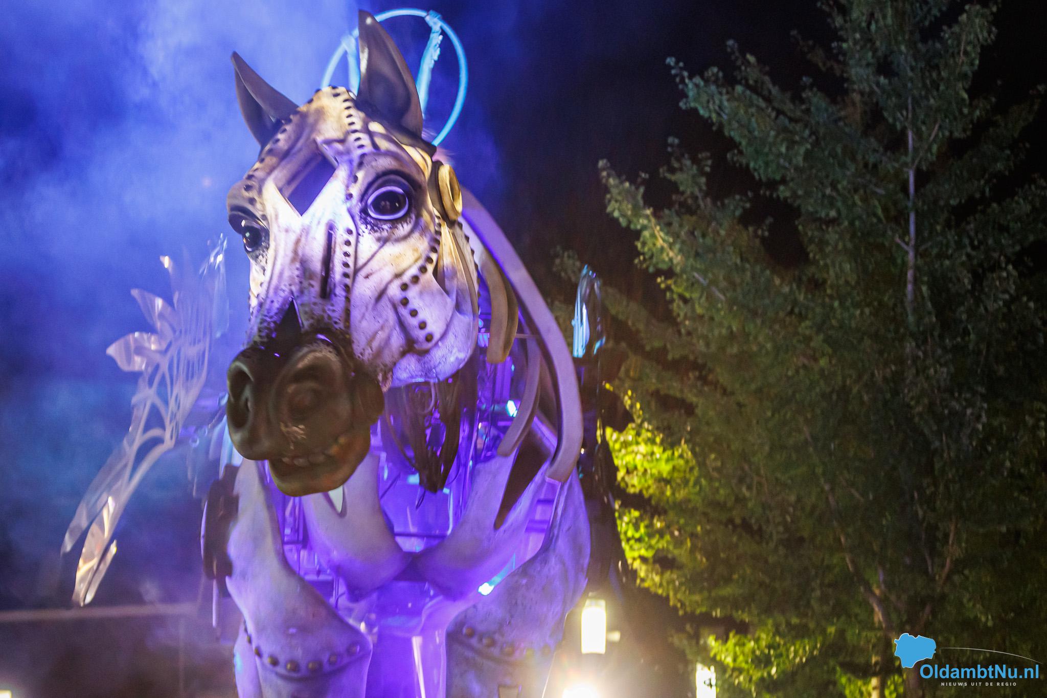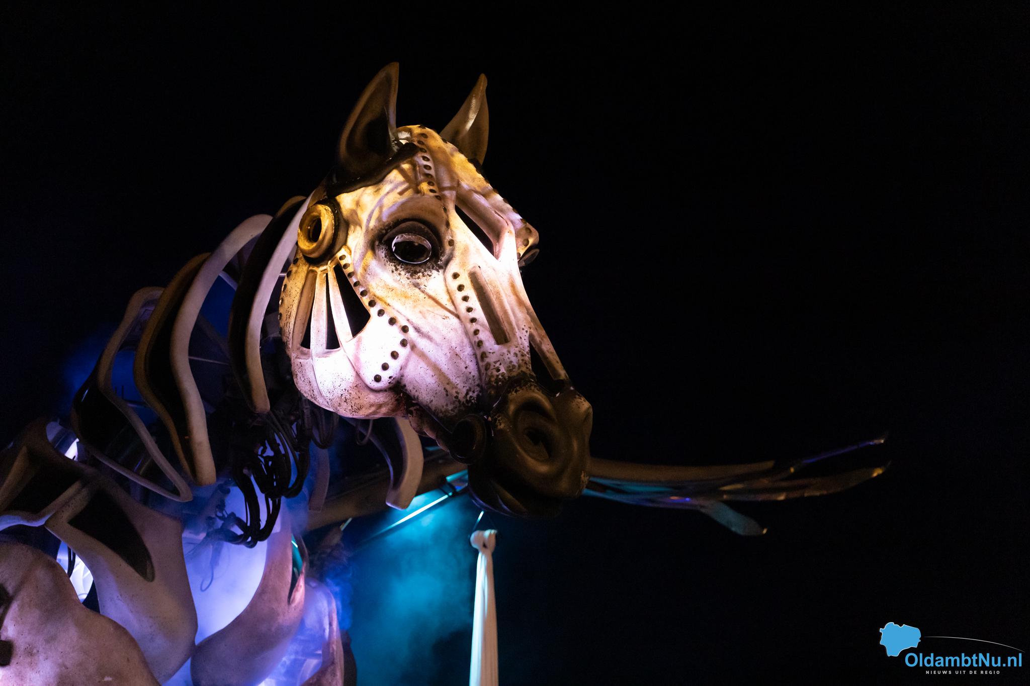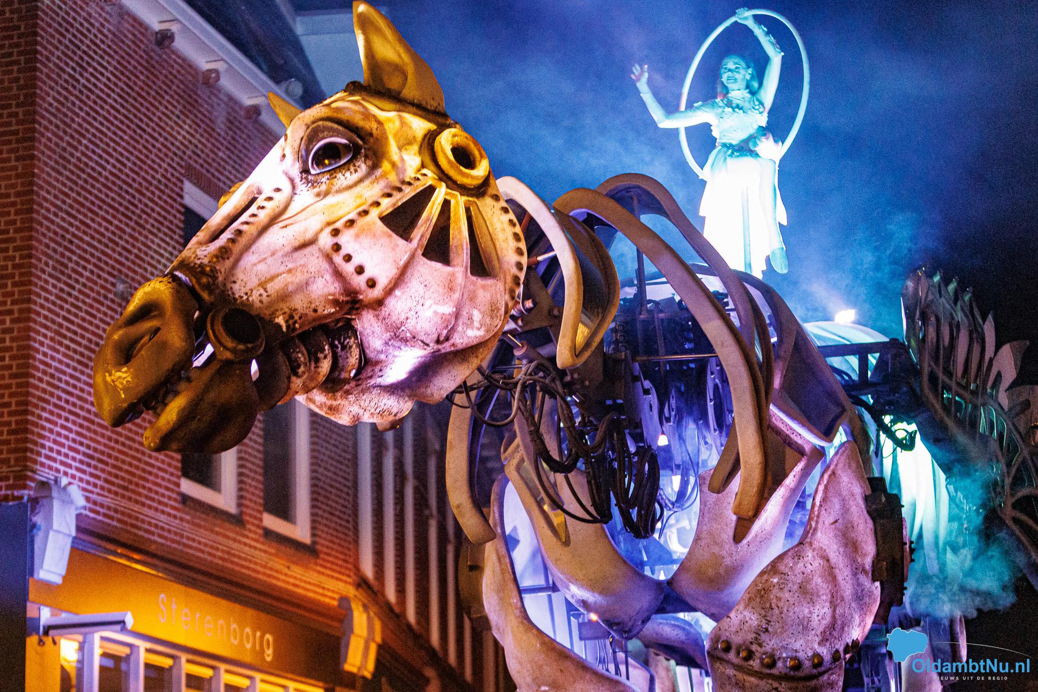 Het reusachtige paard maakte een indrukwekkende tocht via de Langestraat, over het Burgemeester Schönfeldplein, en eindigde op het Marktplein, waar een spectaculaire slotact werd uitgevoerd. De avond werd feestelijk afgesloten met een optreden van de coverband Nughter.