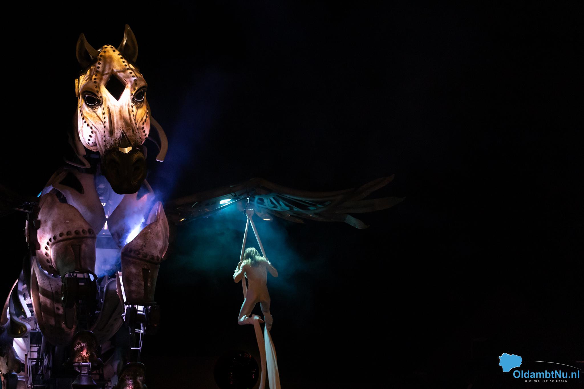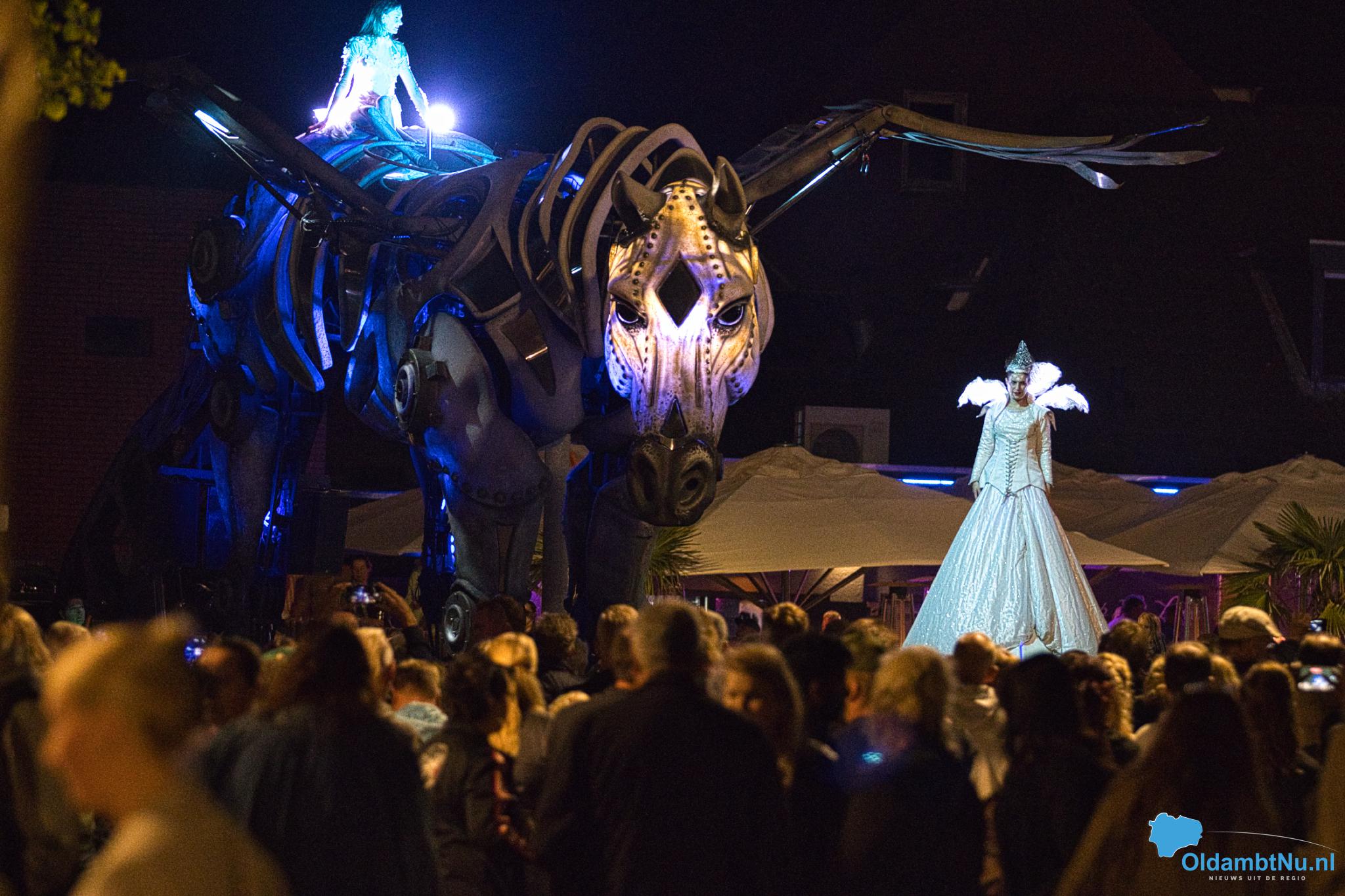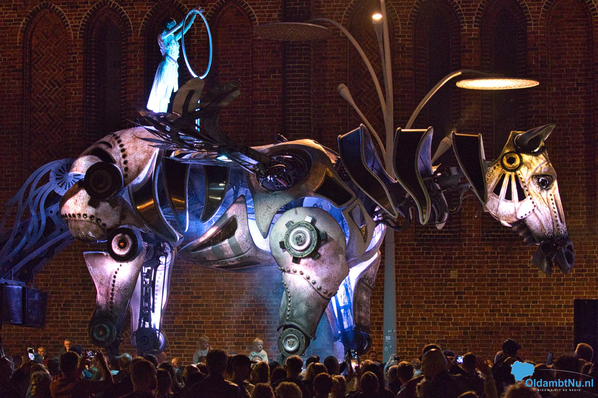 Winschoten – De 9e editie van Straattheaterfestival Waterbei ging gisteravond op spectaculaire wijze van start, met de Franse theatergroep Compagnie Planète Vapeur in de hoofdrol. Het publiek werd getrakteerd op een adembenemende show met ‘Pegase’, een gigantisch wit paard van 10 meter hoog en glinsterende vleugels van 8,9 meter.