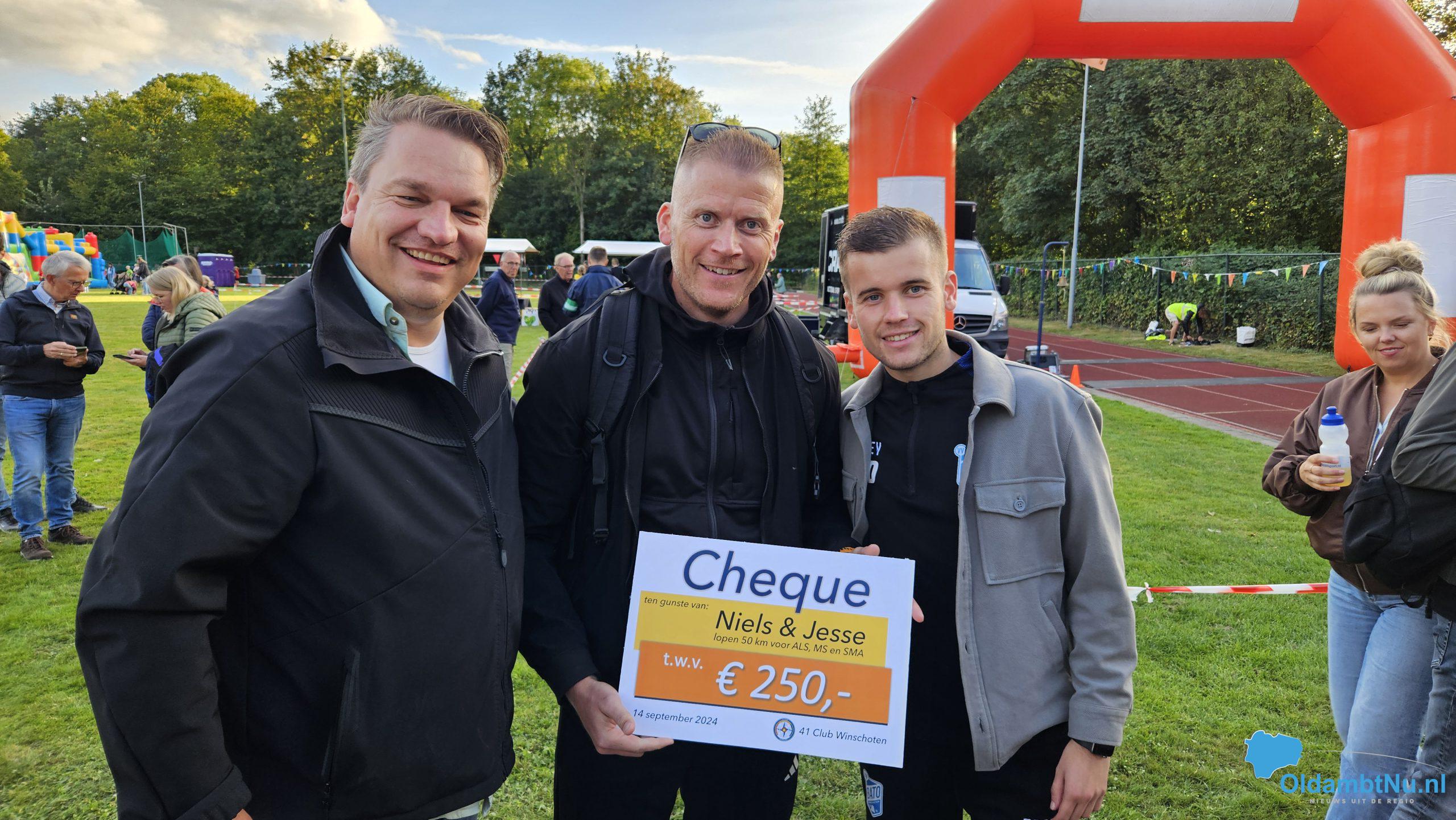 Winschoten- Gisteravond tijdens de LutjeRUN hebben 50 kilometer lopers Jesse en Niels van Delden uit handen van Jan David Niezing van de Club 41 een cheque ontvangen als stimulans voor hun deelname aan de RUN 2024 die vandaag plaatsvindt. Beide renners zamelen geld in voor de ALS stichting. “Wij vinden als Club 41 dit zo’n goed initiatief, dat wij hier graag een geldbedrag tegenover willen stellen”, zegt Jan David.