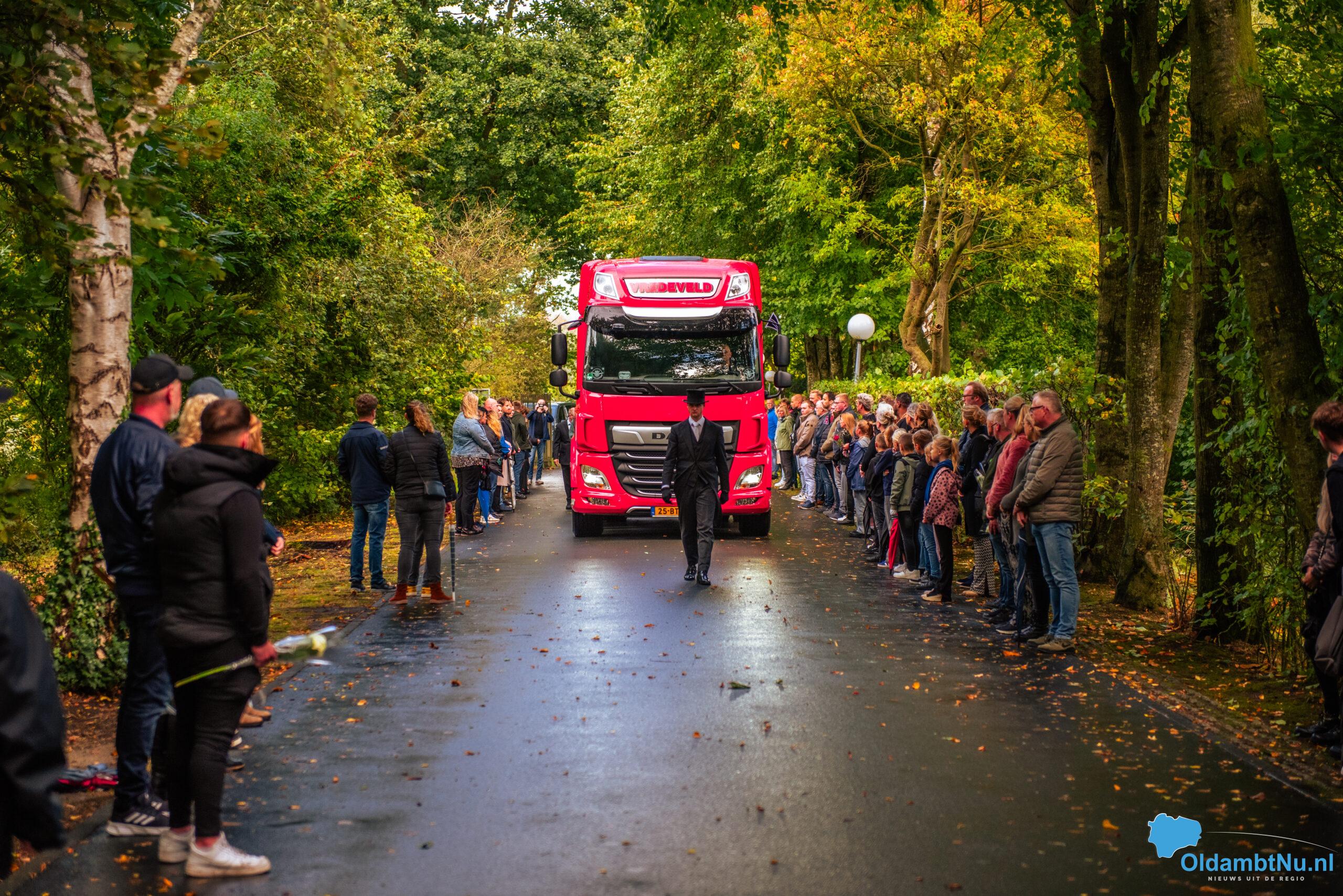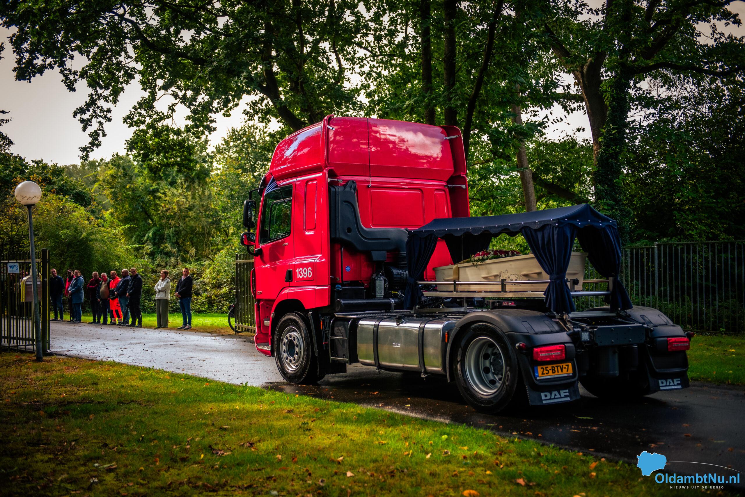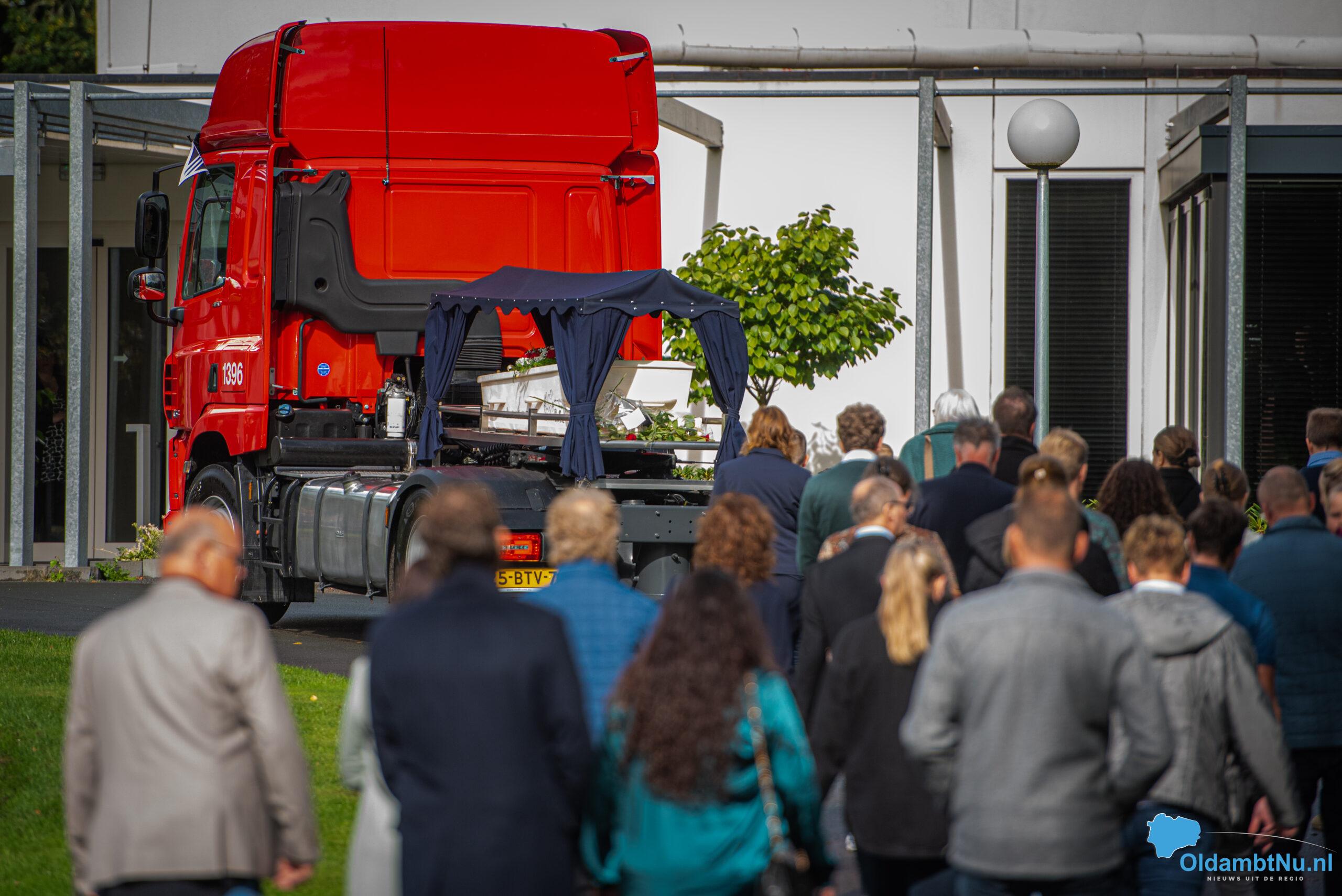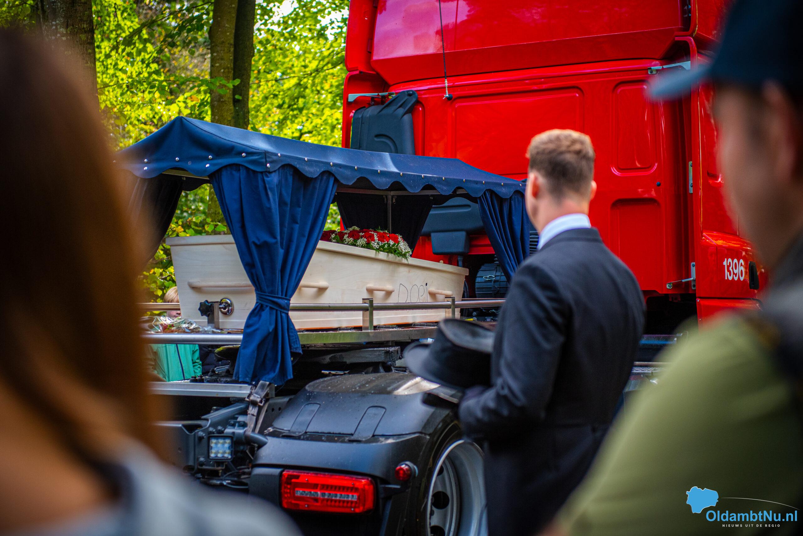 De plechtigheid begon bij Eefting Uitvaartzorg, waar de kist op zijn vrachtwagen werd geplaatst. René werkte als chauffeur bij transportbedrijf Vredeveld uit Hoogersmilde.