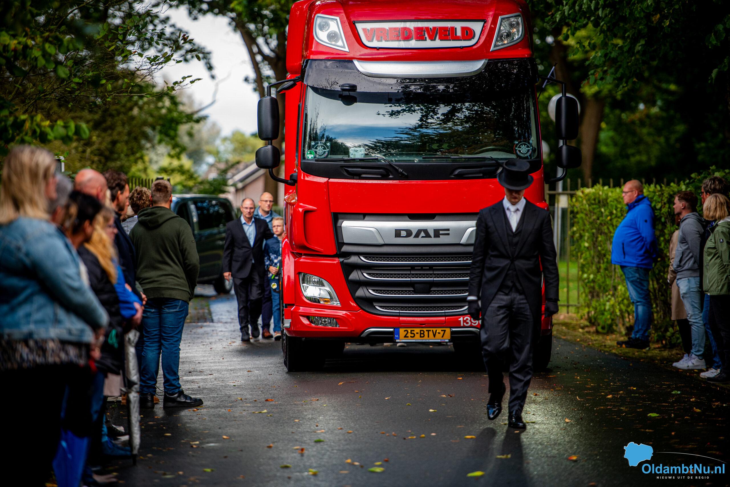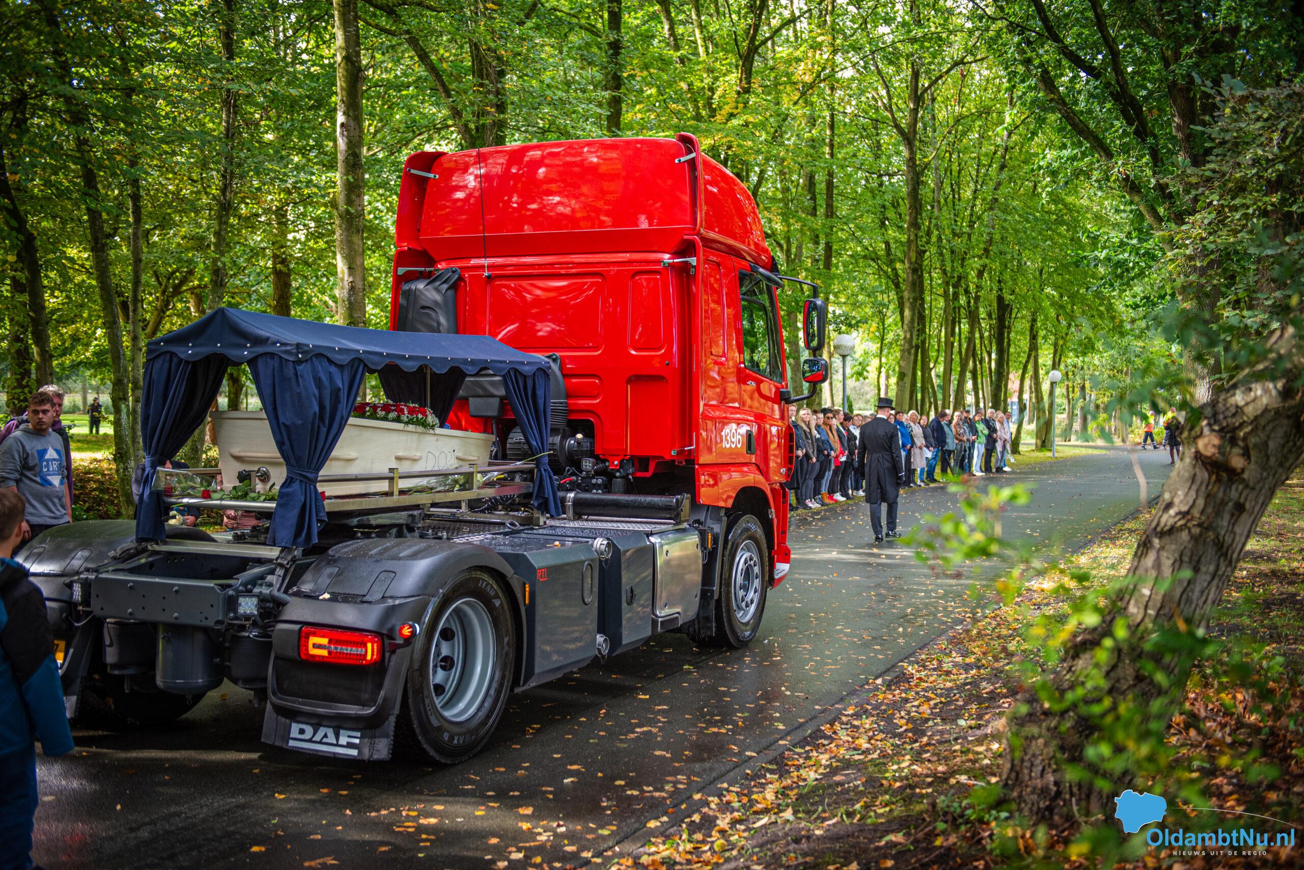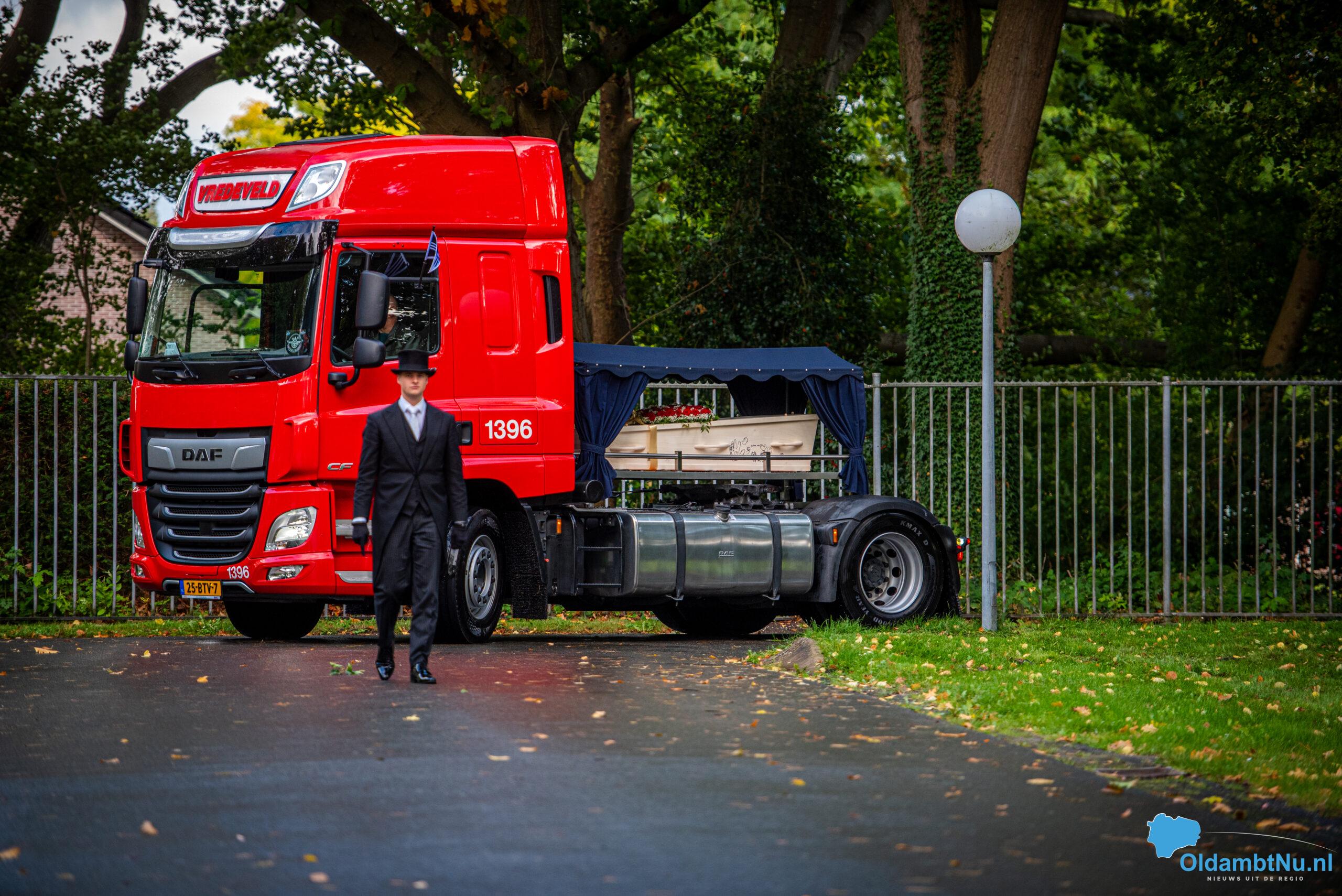 De plechtigheid begon bij Eefting Uitvaartzorg, waar de kist op zijn vrachtwagen werd geplaatst. René werkte als chauffeur bij transportbedrijf Vredeveld uit Hoogersmilde.