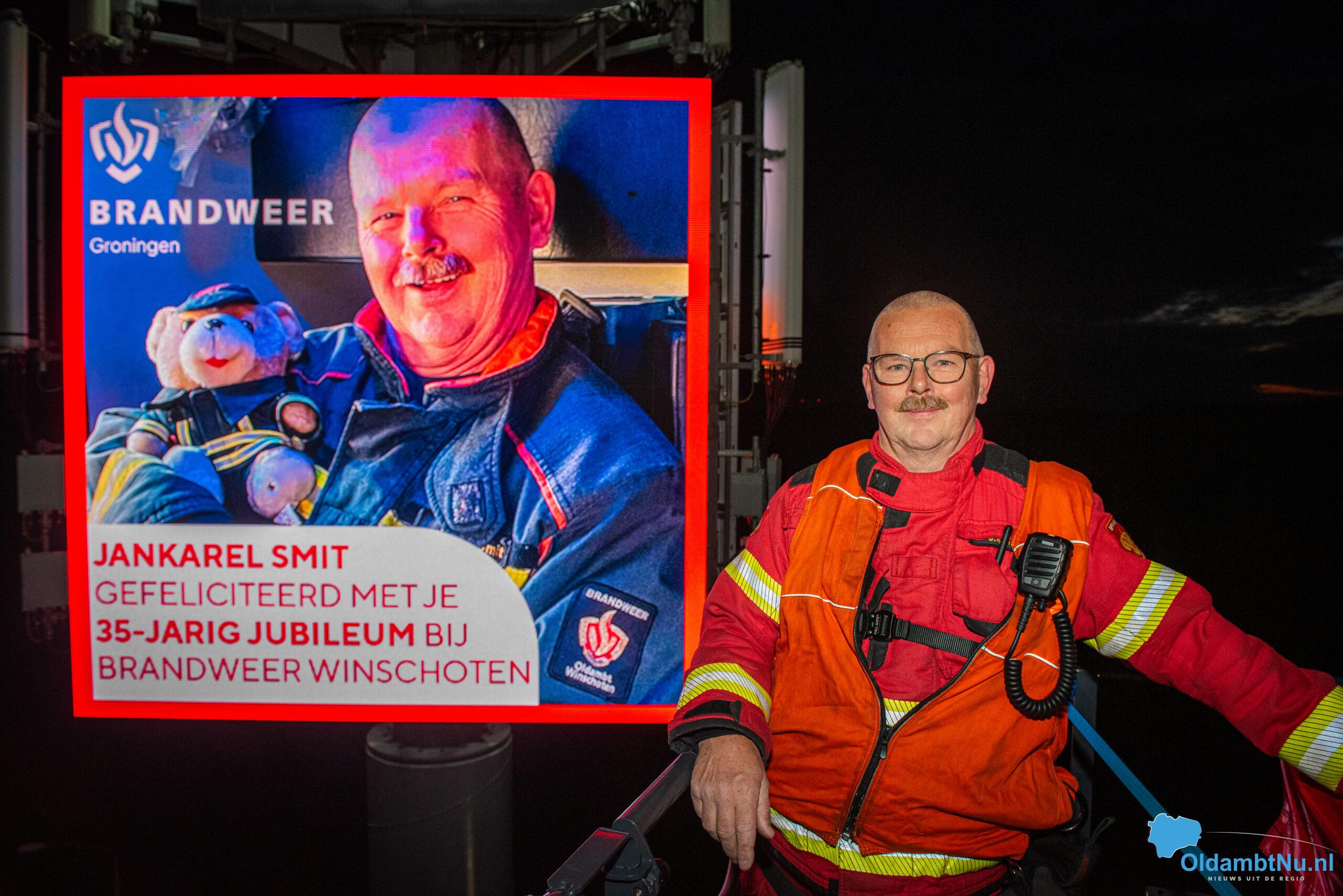 De festiviteiten eindigden niet in de ochtend. Later op de avond, rond 19.00 uur, werd brandweer Winschoten opgeroepen voor een melding aan de Beertsterweg. Bij aankomst bleek het echter om een andere verrassing te gaan: Jan Karel werd opgewacht door al zijn collega’s, en tot zijn verrassing stond zijn naam en foto groot afgebeeld op het LED-scherm op circa 30 meter hoogte. Dit eerbetoon werd georganiseerd in samenwerking met Stichting Promotie Winschoten, die de reclamezuil bij de Blauwe Roos beheert.