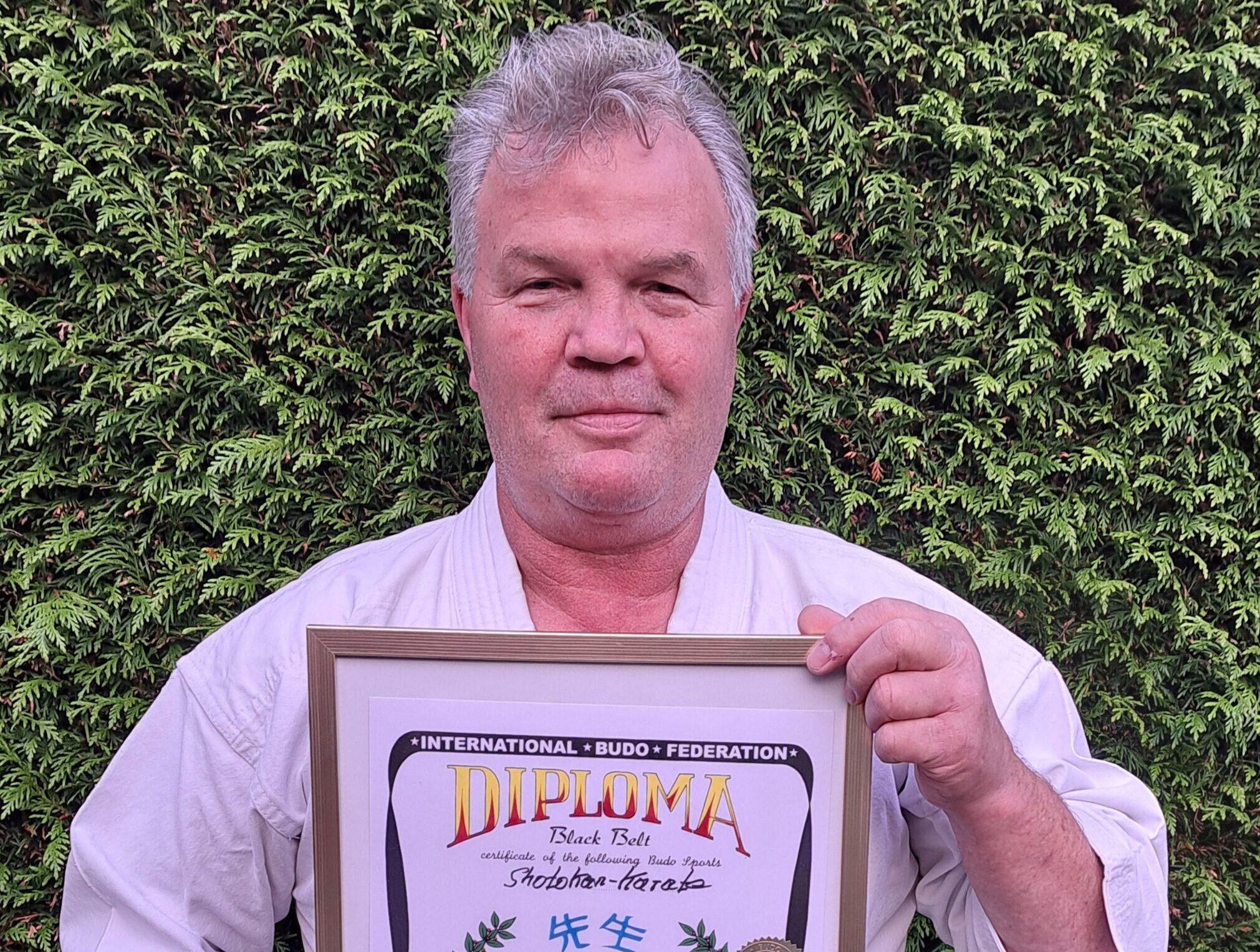 Bé Olthoff (63) gepromoveerd tot 8e DAN Karate tijdens EK in Almere