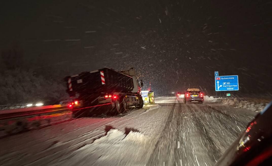 Vrachtwagen met sneeuwschuiver vast in middenberm A7 door gladheid