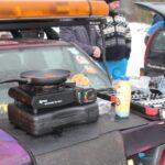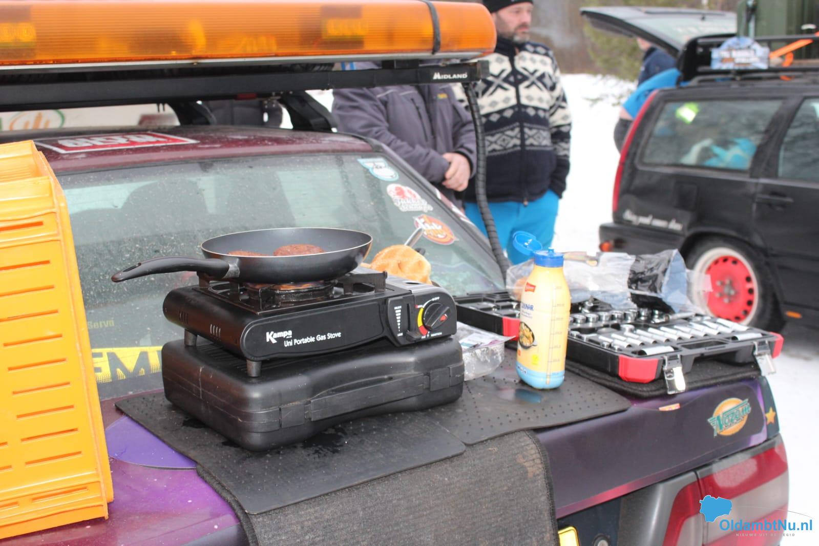 Ergens halverwege de route hadden ze een stop ingepland. Hier klaarde de lucht op en werd het weer droog. Regen was daar de hele dag ook nog niet geweest. “Alle uitklapkeukens werden weer voor de dag getoverd, zo werd er in 15 minuten weer een gigantisch lopend buffet in elkaar getoverd. Geweldig. Inmiddels aangekomen op de grens van Noorwegen. Hier ook traditiegetrouw een stop met borreltje!”, aldus Raymond.