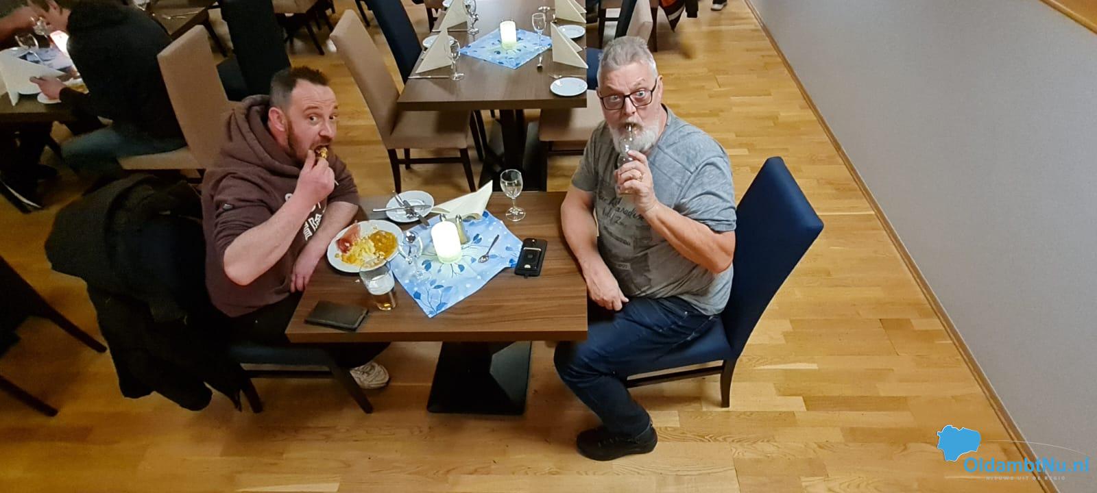 Eenmaal bij het hotel hebben de deelnemers de route voor de volgende dag opgehaald. Gauw een hapje eten met de hele club. “Pilsje, borreltje, bedtijd!”