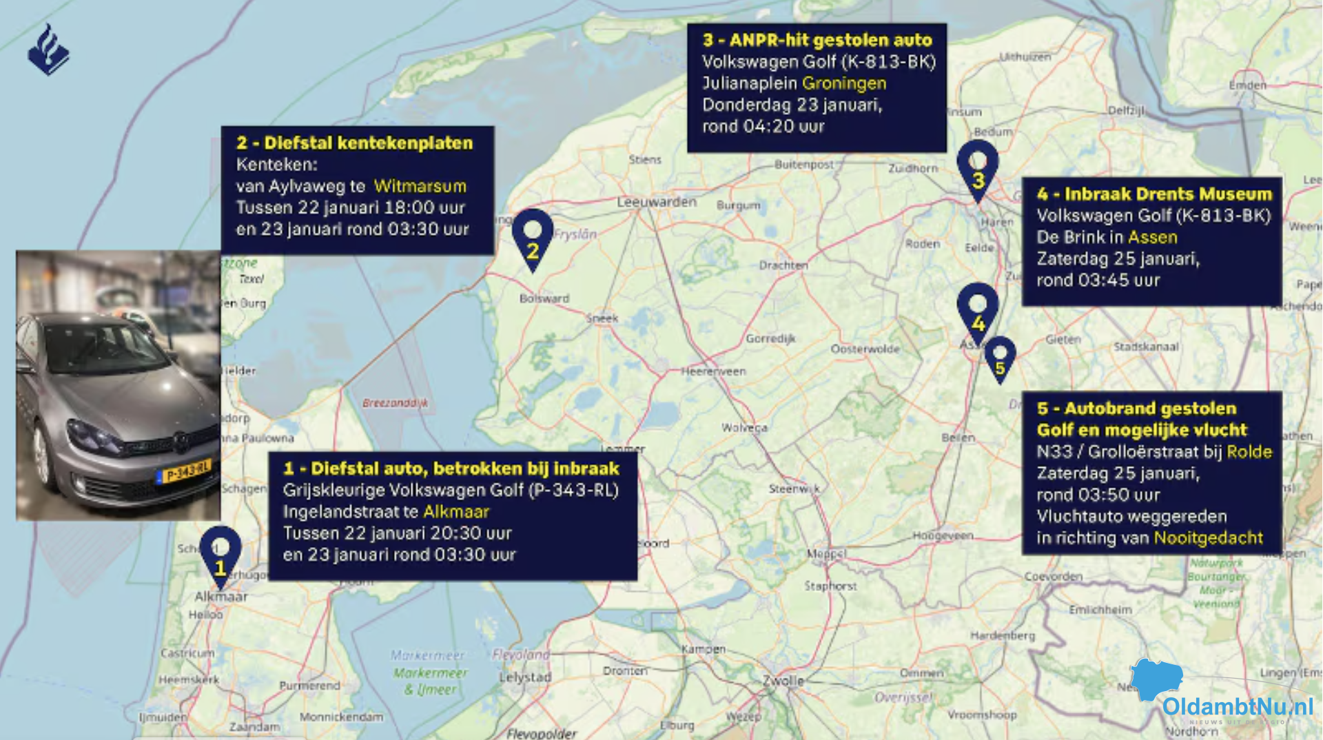 Uit het onderzoek is naar voren gekomen dat de grijskleurige Volkswagen Golf (toen nog met eigen kenteken P-343-RL) is gestolen vanaf de Ingelandstraat in Alkmaar. Dat moet zijn gebeurd tussen woensdagavond 22 januari tussen 20:30 uur en 03:30 uur die nacht erop. Ook weet de politie dat in ongeveer diezelfde tijdsperiode kentekenplaten (K-813-BK) zijn gestolen vanaf de van Aylvaweg in Witmarsum, vlakbij de A7.