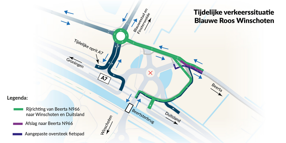Winschoten – De tijdelijke weg bij knooppunt de Blauwe Roos in Winschoten wordt aangepast om de doorstroom van verkeer te verbeteren. Vanaf dinsdag 11 februari rijdt verkeer vanuit Beerta verplicht via de tijdelijke rotonde Blauwe Poort richting Winschoten of Duitsland. Ook de fietsoversteek naar Beerta wordt aangepast.