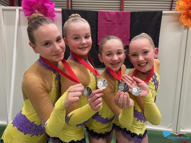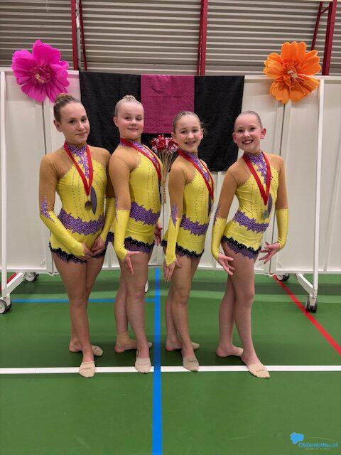 De prejunioren waren aan het eind van de dag aan de beurt. De groep ( Maud, Zara, Rose en Caress) begon met de bal-oefening. Met een nagenoeg vlekkeloze presentatie werd dit beloond met zilver. Ook de hoepel-oefening in de 2e ronde werd super gedraaid en in een sterk deelnemersveld uiteindelijk een 4e plaats voor de meiden.