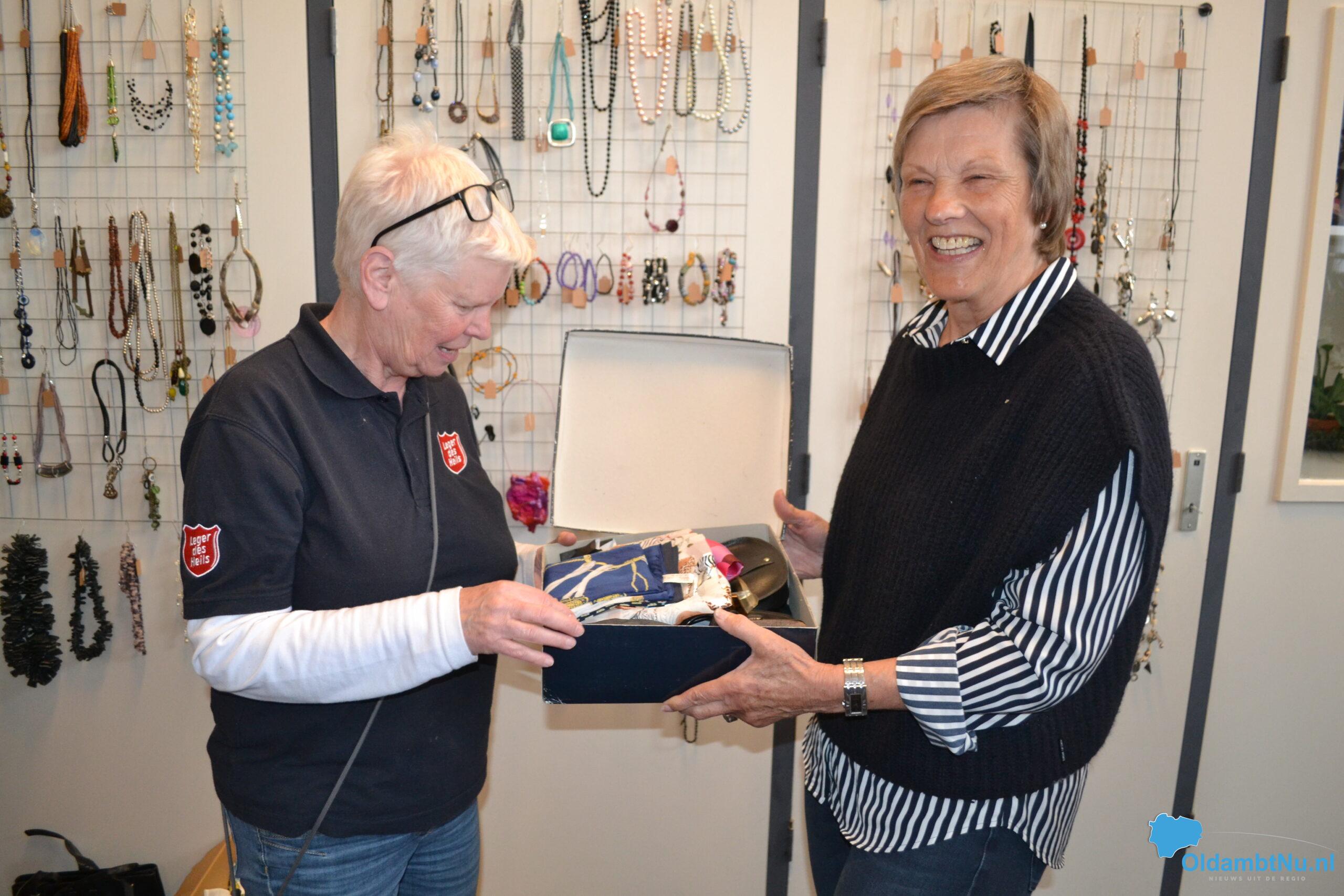 Op maandagmiddag 14 april zijn de ruim 100 sieraden, 80 sjaaltjes, 25 tassen en tasjes, gewassen, gestreken en opgepoetst, overhandigd aan Bineke Berkenbosch, kapitein van het Leger des Heils in Winschoten. In een hoekje van de ruime winkel hebben we een boetiekje ingericht. “Dit komt hier goed van pas,” aldus Bineke. “Nu kunnen we net iets meer bieden. Een mooie sjaal of sieraad maakt de kleding af. Dit geeft de mensen die hier komen kopen meerwaarde. Dat is ook belangrijk.”