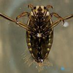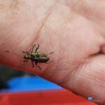 Bovenwater zagen we op oeverplanten parende liesgrasrietkevers, een zwartpootsoldaatje vloog op onze lunchtafel en op het water langs de oever probeerde een poelpiraat zich uit de acht poten te maken voor de enthousiaste kinderen. Maar de ooievaar verderop trok zich nergens wat van aan en stapte parmantig verder door het hoge gras.