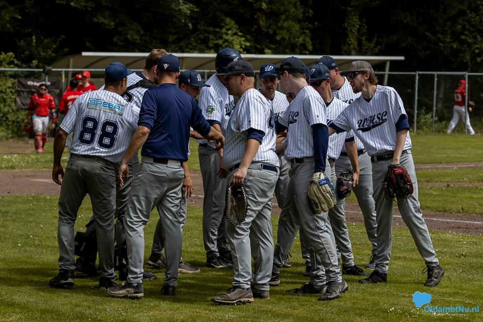 In de eerste slagbeurt wist W.H.S.C. nog geen vuist te maken. Alleen Martin bereikte de honken na geraakt werper, maar verder kwam de aanval niet op gang. De tweede inning werd gekenmerkt door slordigheden in het veld bij de Winschoters, wat resulteerde in drie extra punten voor de bezoekers: 0-5.