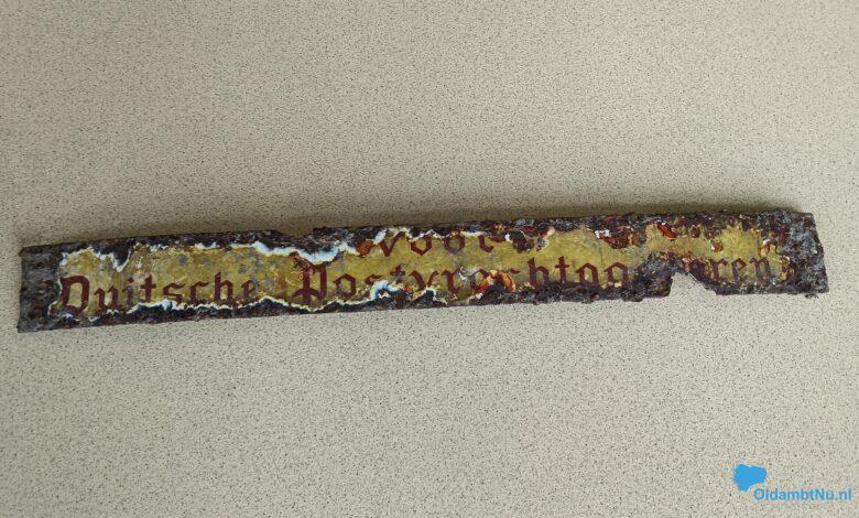 Zuidbroek– Tijdens de voorbereidende werkzaamheden voor de herbouw van het voormalige kantoorgebouwtje van Van Gend & Loos, direct naast het Noord-Nederlands Trein & Tram Museum, is onlangs een opmerkelijke vondst gedaan. Bij het afgraven van de oude fundering werd een emaillebordje aangetroffen met het opschrift: ‘Voor Duitsche Postvrachtgoederen’.