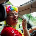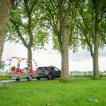 De auto met feestgangers en een mascotte in de aanhangwagen stopt naast een oud stel. Ze lachen als ze uitgedaagd worden tot een dansje. Uit de deuropeningen van huizen steken nieuwsgierige hoofden naar buiten.