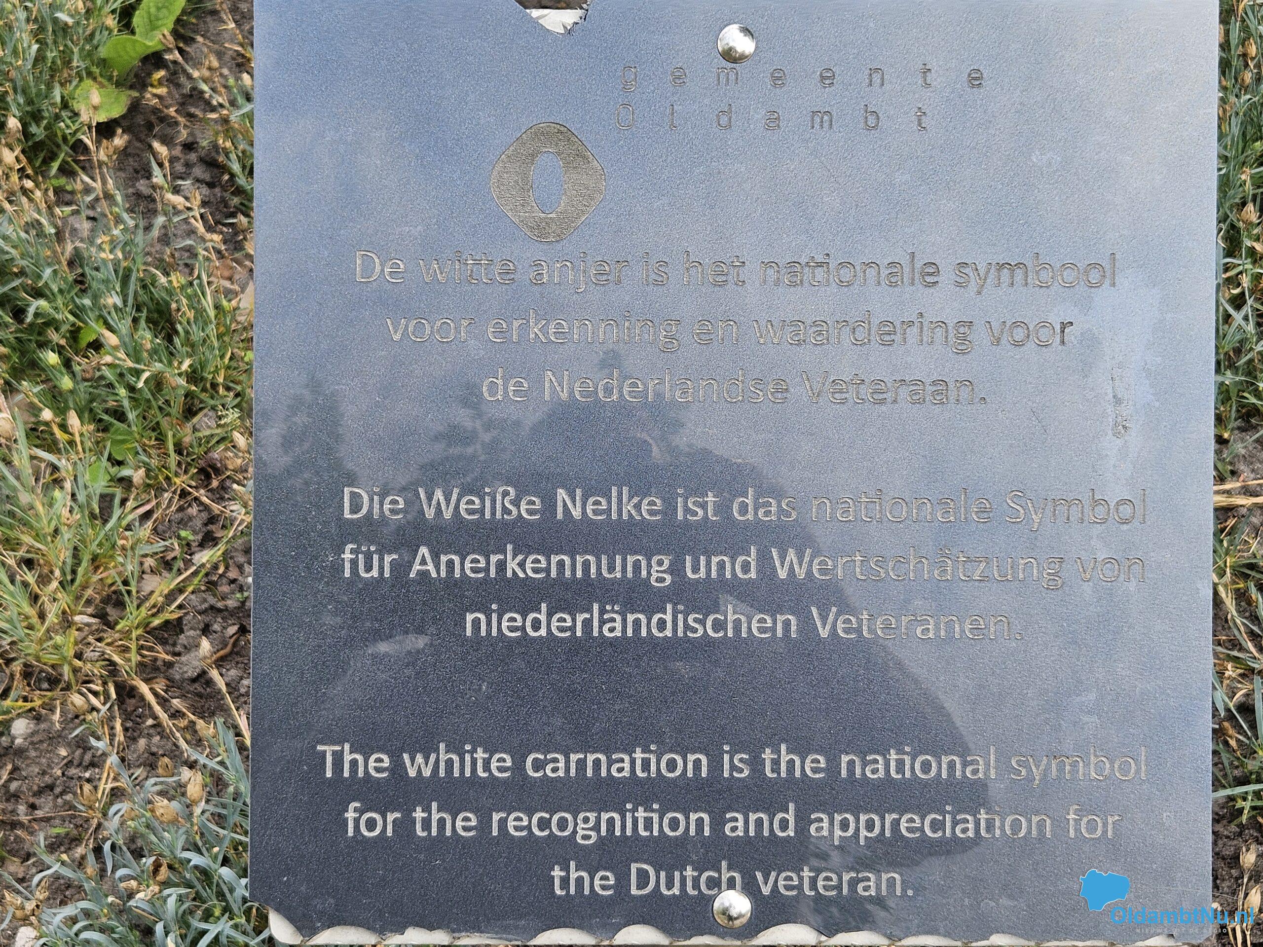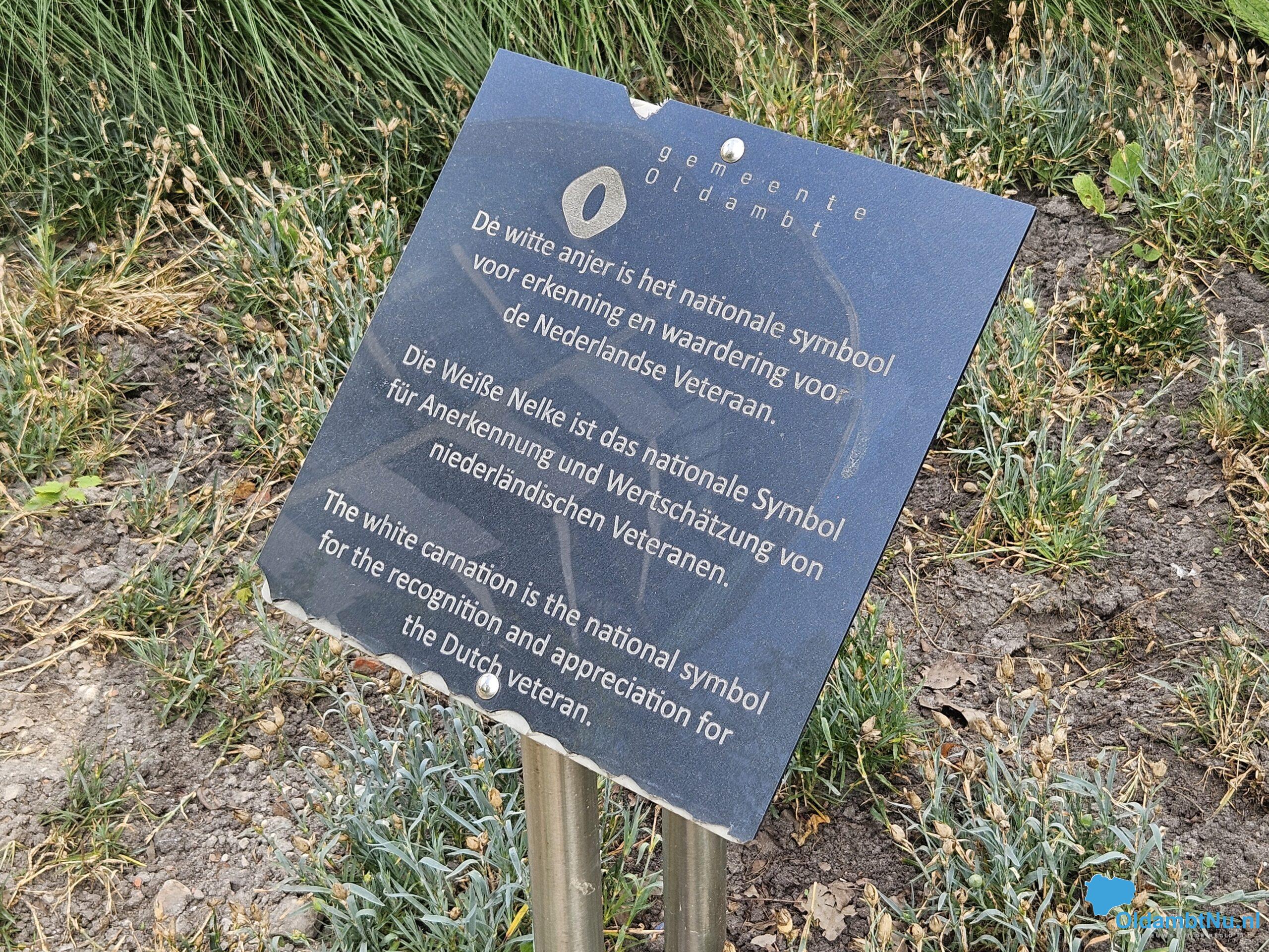 Deze plaquette staat in een perk waar in het voorjaar en deel van de zomer witte anjers bloeien. De witte anjer staat als nationaal symbool voor erkenning en waardering voor de Nederlandse Veteraan.