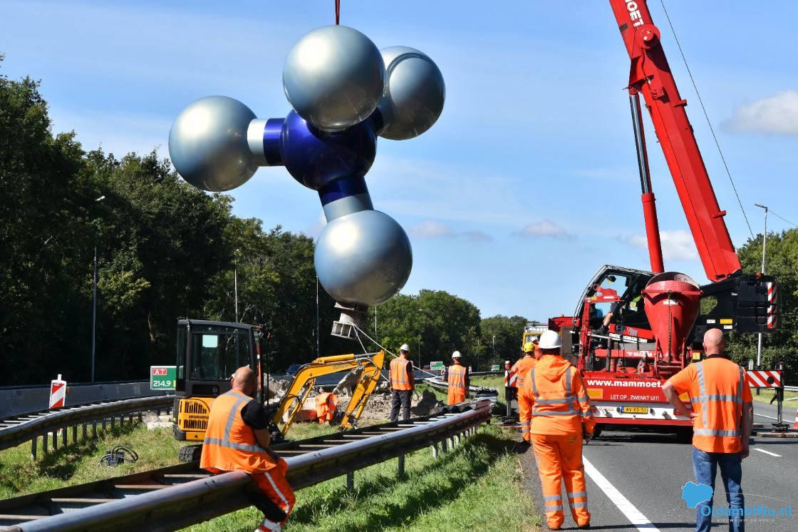 Hoogezand – Afgelopen zaterdag is het kunstwerk ‘het Gasmolecuul’ van kunstenaar Marc Ruygrok van zijn plek uit de middenberm van de A7 verwijderd. Het kunstwerk is met een kraan van zijn plek getakeld en vervolgens getransporteerd naar de carpoolplaats bij de afrit Hoogezand van de A7. Daar is het voorzichtig uit elkaar gehaald. Daarna wordt het naar een speciale werkplaats vervoerd voor restauratie.