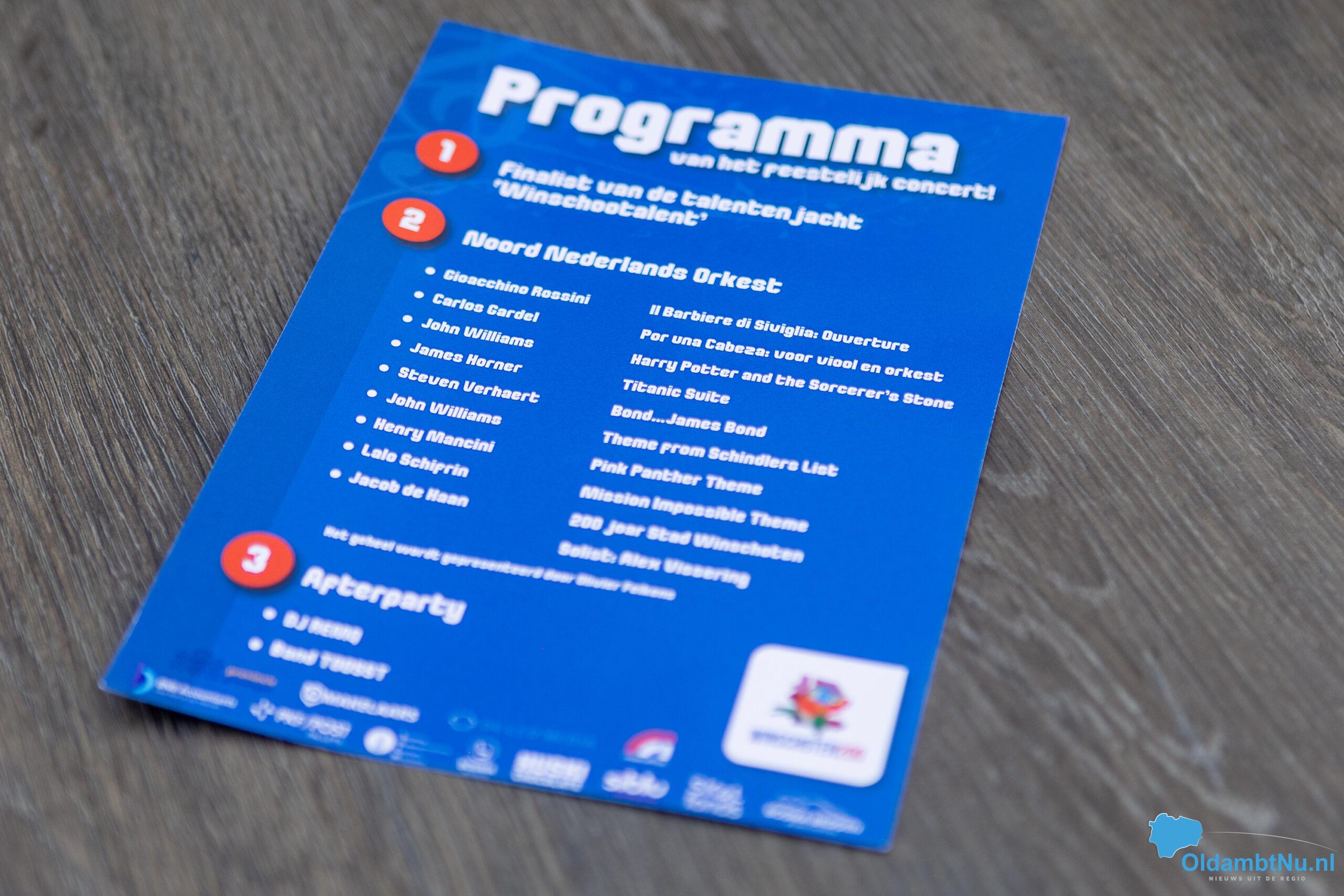 Presentator Olivier Feikens, bekend van musical en tv, liet als eerste burgemeester Cora-Yfke Sikkema en gedeputeerde Pascal Roemers aan het woord om de avond echt te openen. En toen was het podium voor de winnaar van de talentenjacht Winschootalent, de 15-jarige Emile Teuben. Met een door hemzelf aangepast nummer van Eric Clapton en een innemend optreden wist hij de handen van het publiek op elkaar te krijgen.