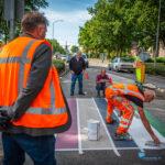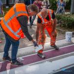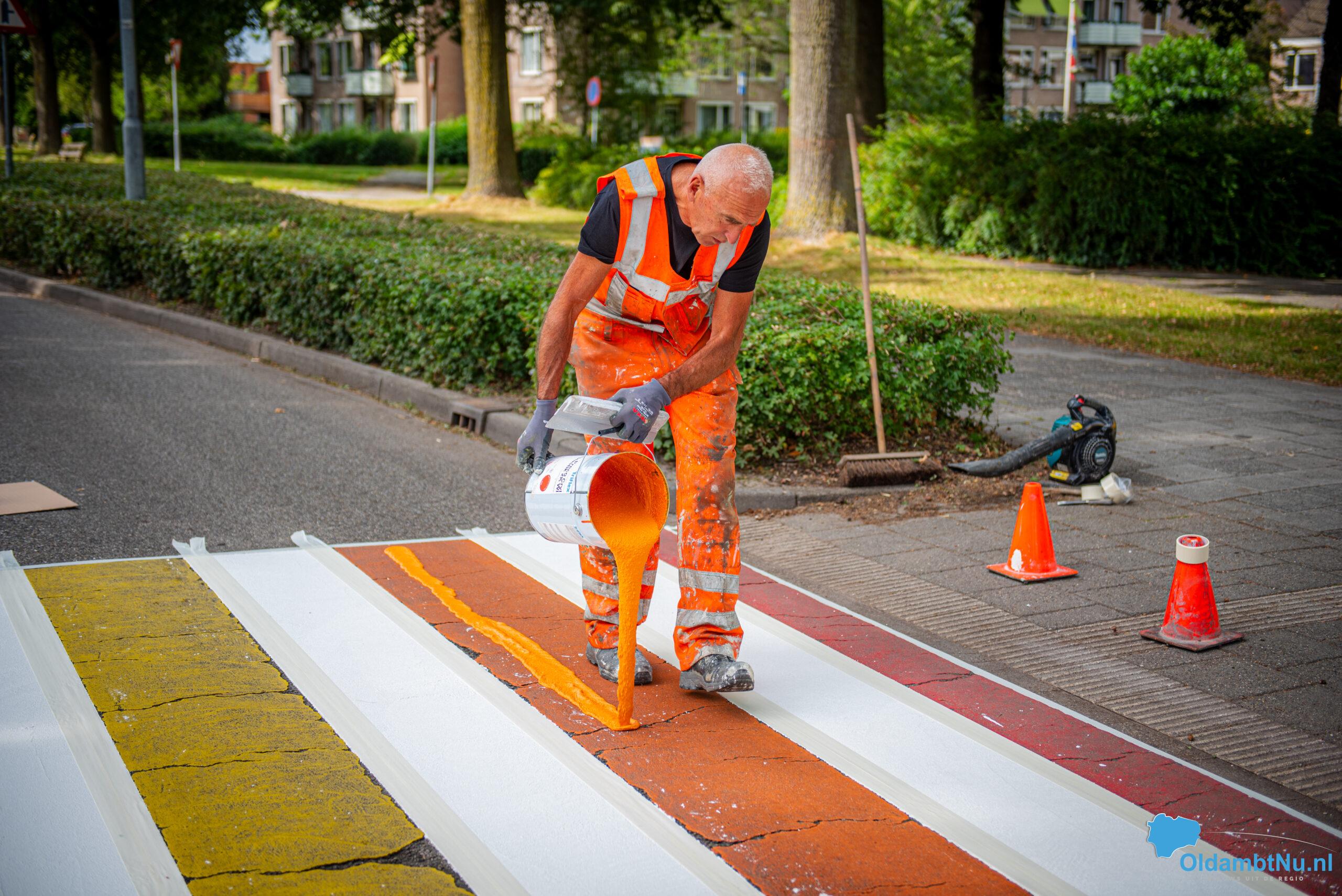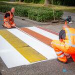 Winschoten – Het regenboogzebrapad aan de Mr. D.U. Stikkerlaan in Winschoten heeft woensdagmiddag een frisse verflaag gekregen. Het pad, dat sinds oktober 2016 het straatbeeld siert, werd eerst grondig schoongemaakt en daarna opnieuw in de regenboogkleuren geschilderd.