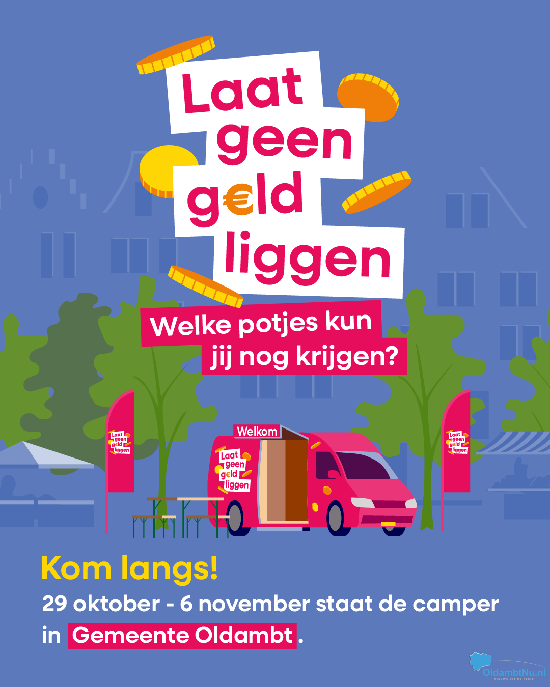 Wist je dat veel mensen toeslagen en regelingen mislopen terwijl ze er wél recht op hebben? Misschien jij ook! In Nederland zijn er allerlei regelingen en toeslagen van de overheid en gemeenten die je inkomen kunnen aanvullen. Maar lang niet iedereen weet hoe ze die kunnen vinden of aanvragen. Laat jij misschien geld liggen? Bij de ‘Laat geen geld liggen’-camper kijken we samen of je misschien geld misloopt. Gemiddeld levert zo’n check honderden euro’s per jaar op. De actie is een initiatief van de SchuldHulpMaatje, Humanitas, STAP, Dichte Knip en Leger des Heils ondersteund door Geldfit en de Rijksoverheid.