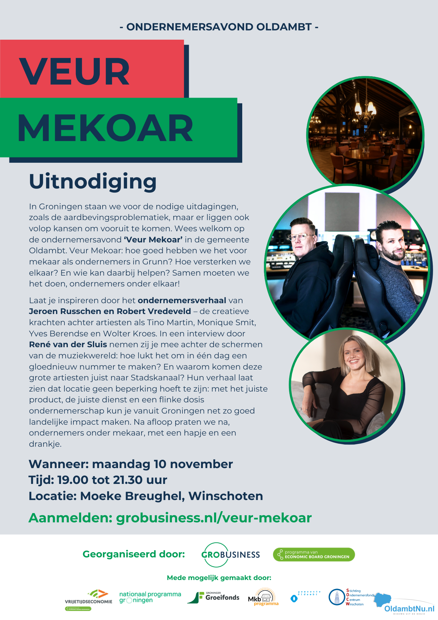 Oldambt – Op maandag 10 november organiseert GroBusiness/Economic Board Groningen de ondernemersavond Veur Mekoar. Na eerdere succesvolle edities met onder andere Sem Schilt en Tik Tok Tammo gaan we dit keer naar de gemeente Oldambt.