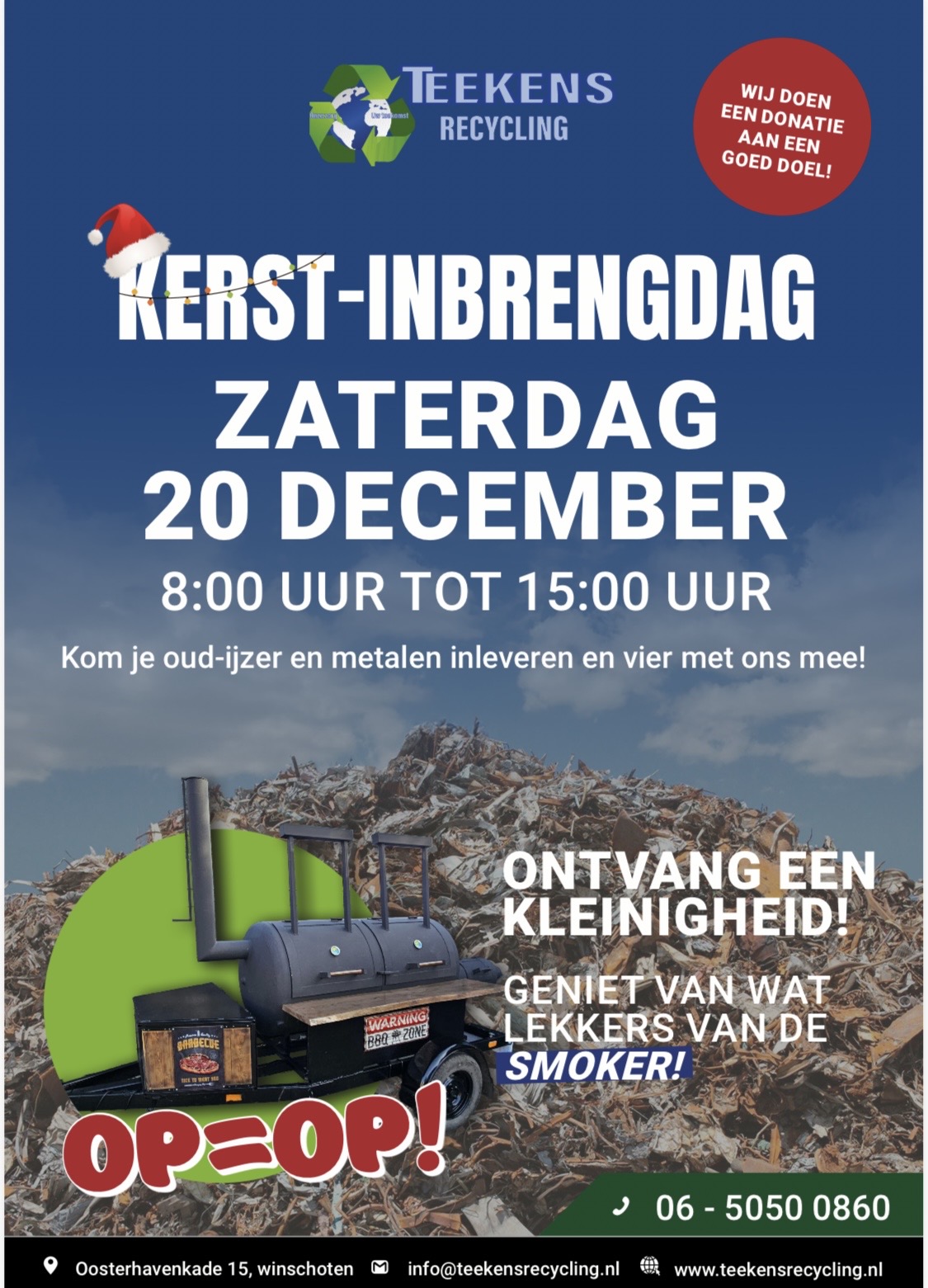 Tijdens de kerst-inbrengdag trakteert Teekens Recycling iedereen die materiaal komt brengen op iets lekkers van de smoker. Daarnaast ontvangt iedere bezoeker een kleinigheid, zolang de voorraad strekt. Het bedrijf benadrukt dat het hiermee klanten wil bedanken voor het afgelopen jaar.