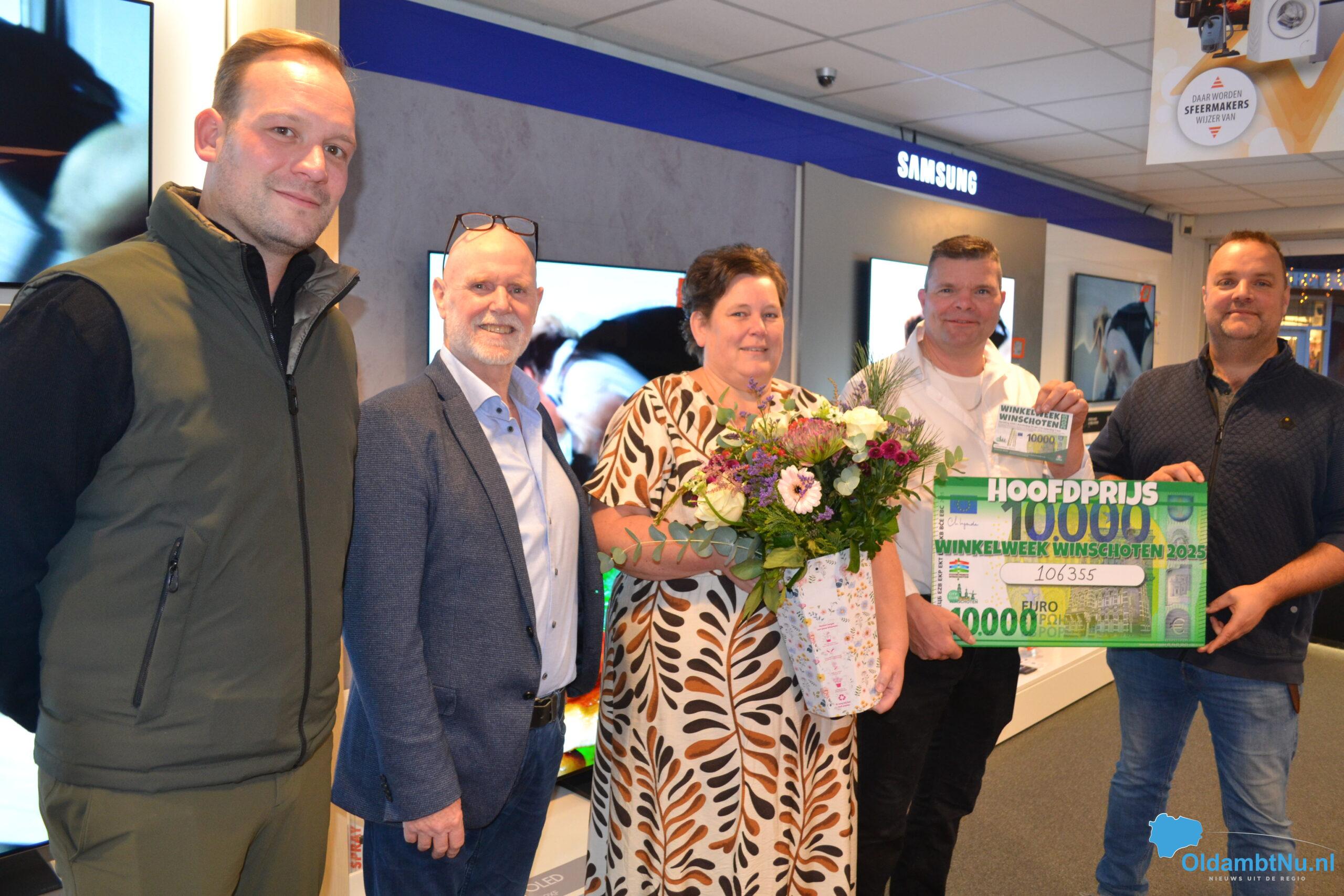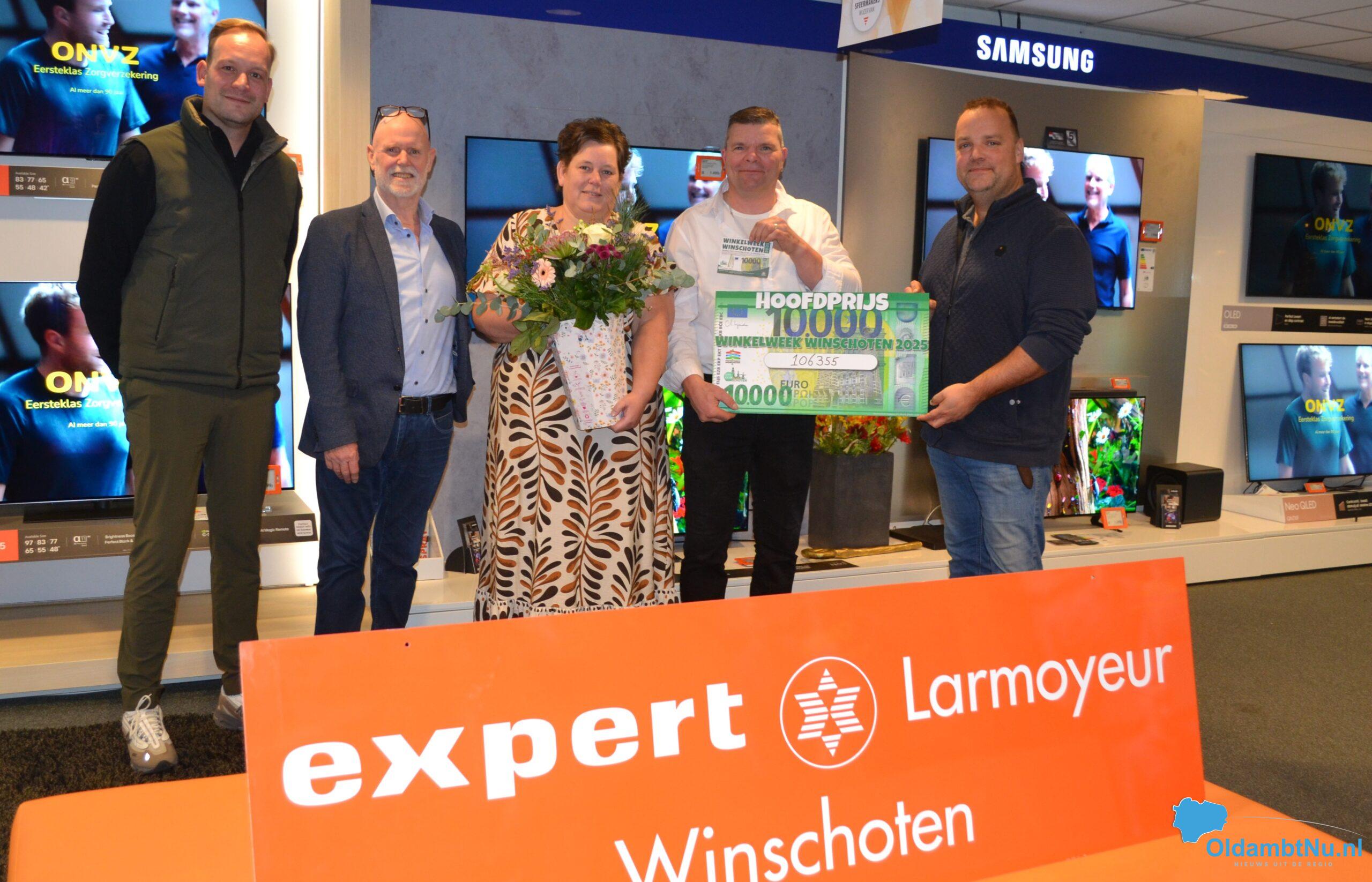 Winschoten – Tijdens de Winkelweek 2025 in Winschoten is de hoofdprijs van maar liefst € 10.000,- gevallen op de naam van Bas en Rianne Engelbart uit Vriescheloo. Zij kochten tijdens de actieperiode een nieuwe televisie bij Expert Larmoyeur in de binnenstad van Winschoten en kregen bij deze aankoop een flinke stapel Winkelweek-loten mee.