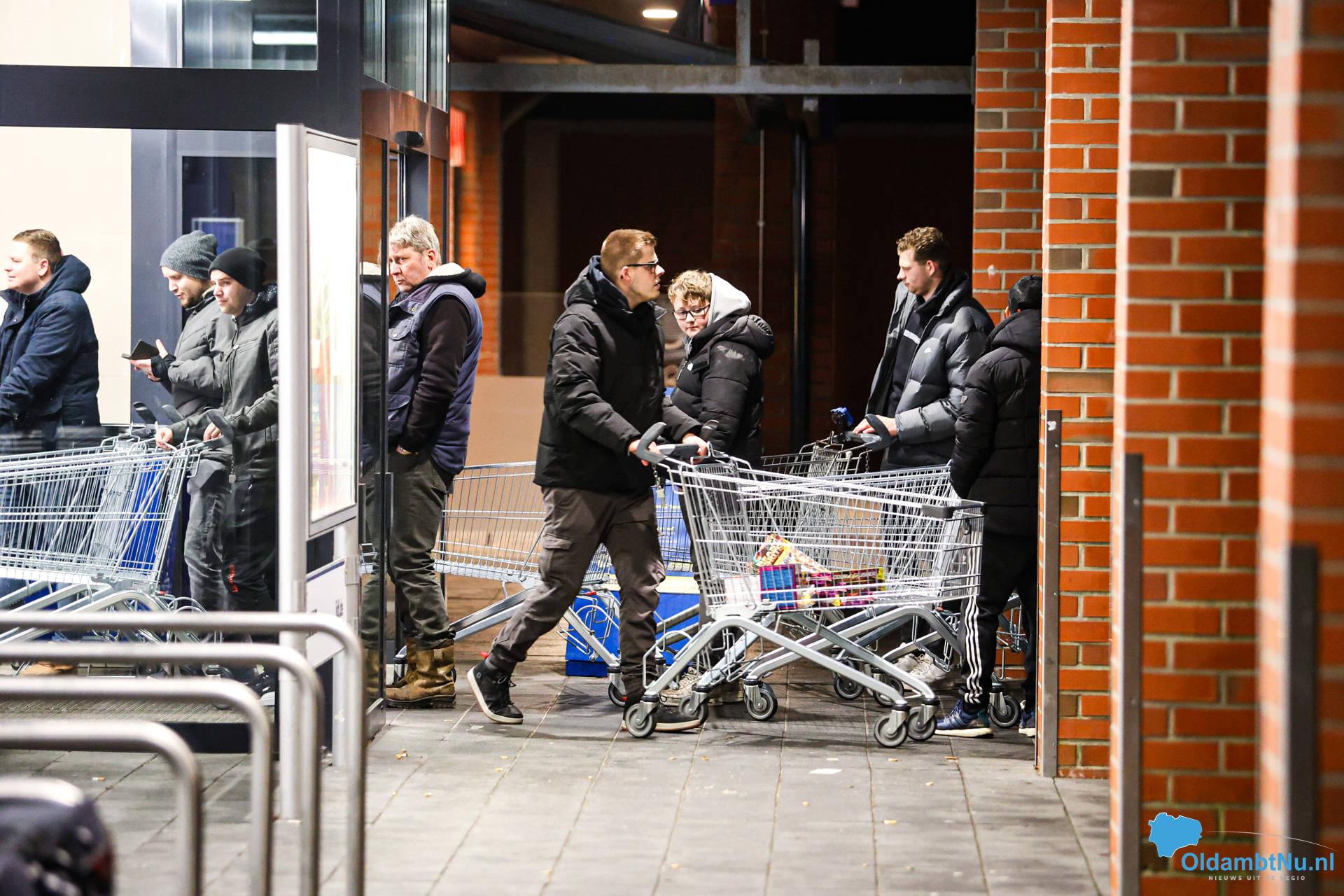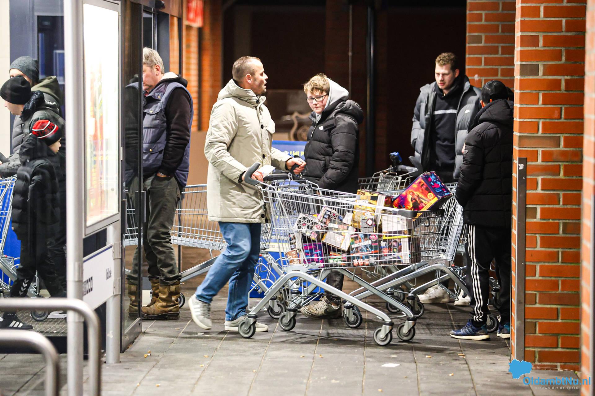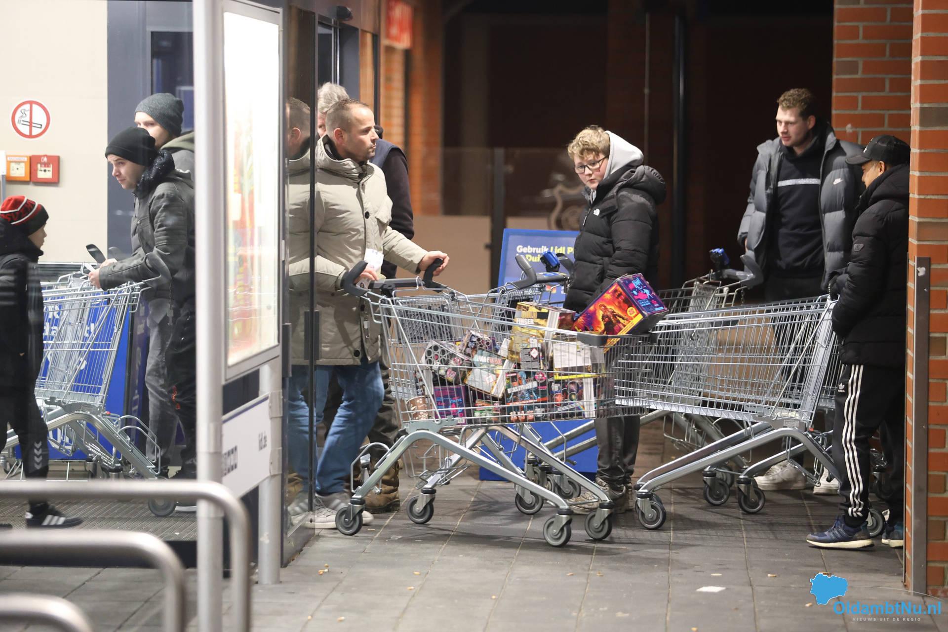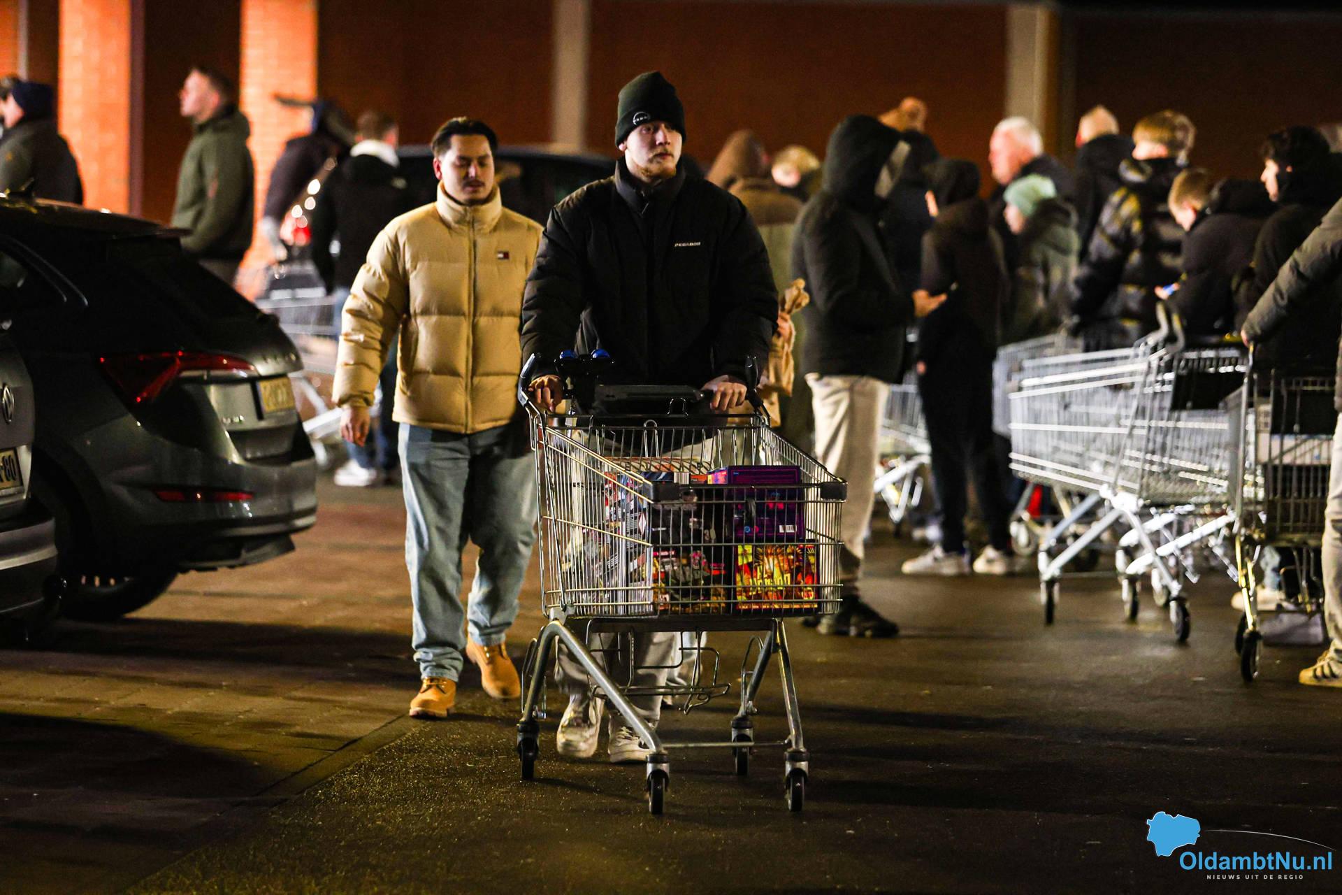 De eerste bezoekers hebben hun aankopen al gedaan. De winkelkarren zijn goed gevuld met vuurwerk, terwijl de drukte in de omgeving nog steeds toeneemt.