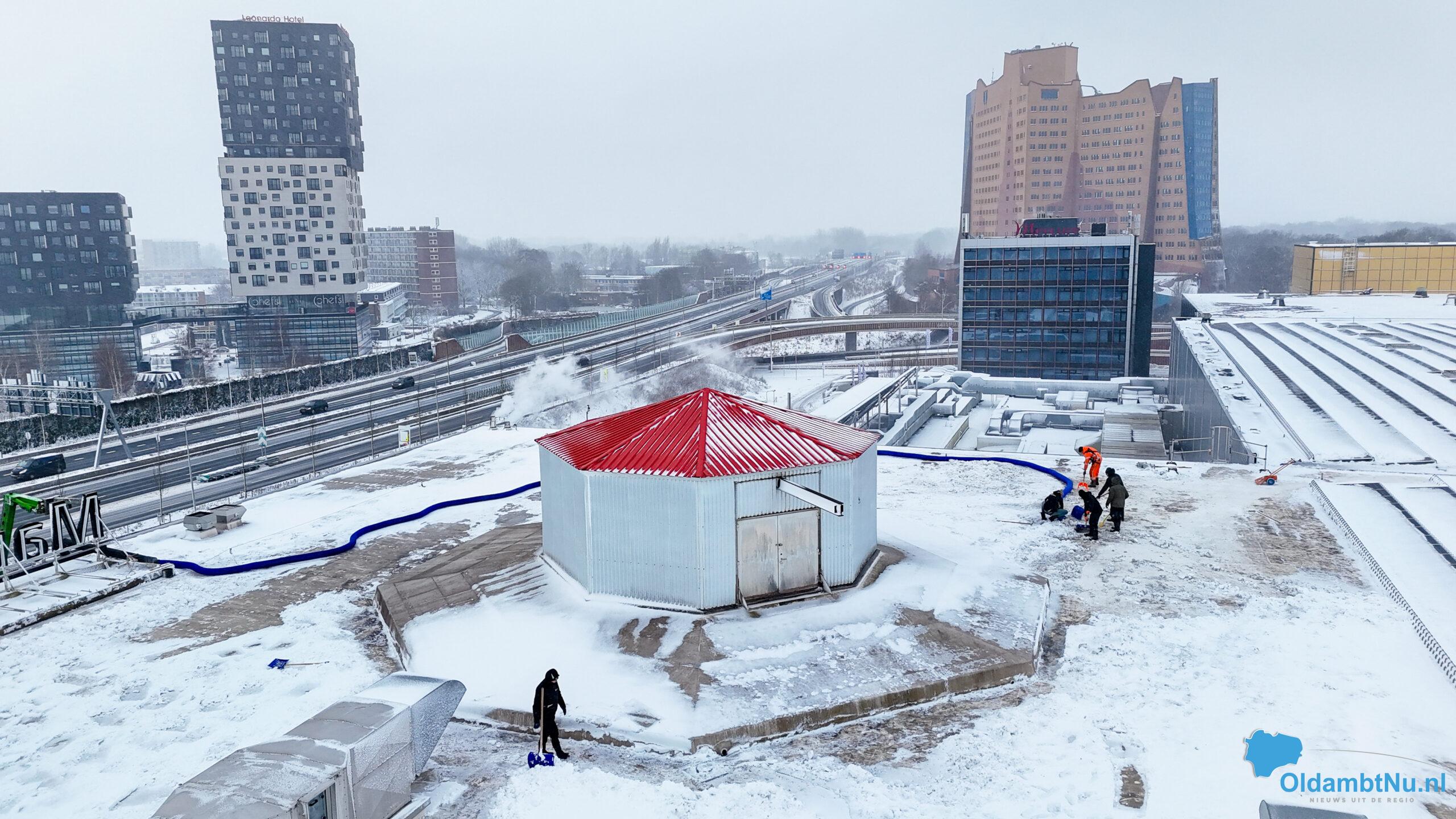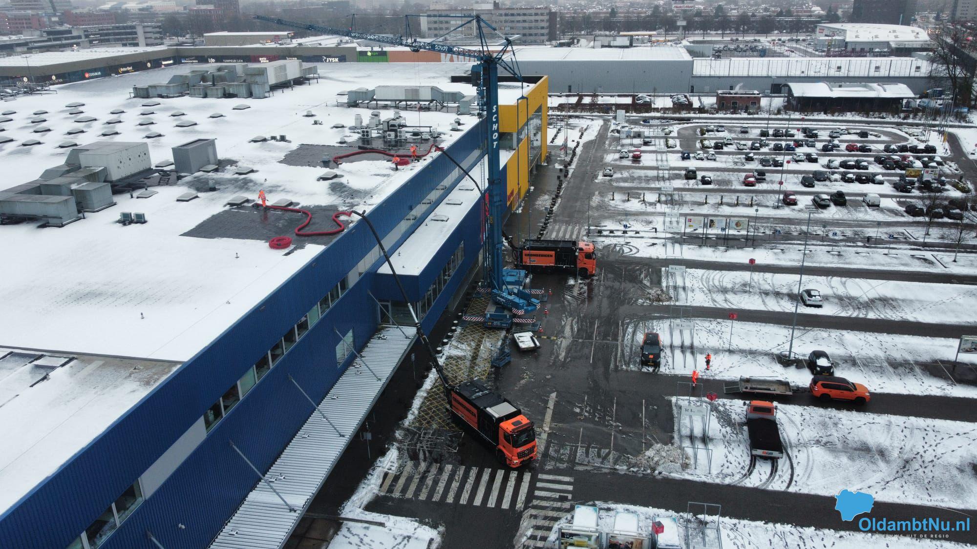 In Groningen is de afgelopen dagen dag en nacht gewerkt op het dak van IKEA. Sinds vrijdagochtend is het team actief bij Martiniplaza, waar sneeuw van het dak wordt gezogen om de constructie te ontlasten.
