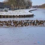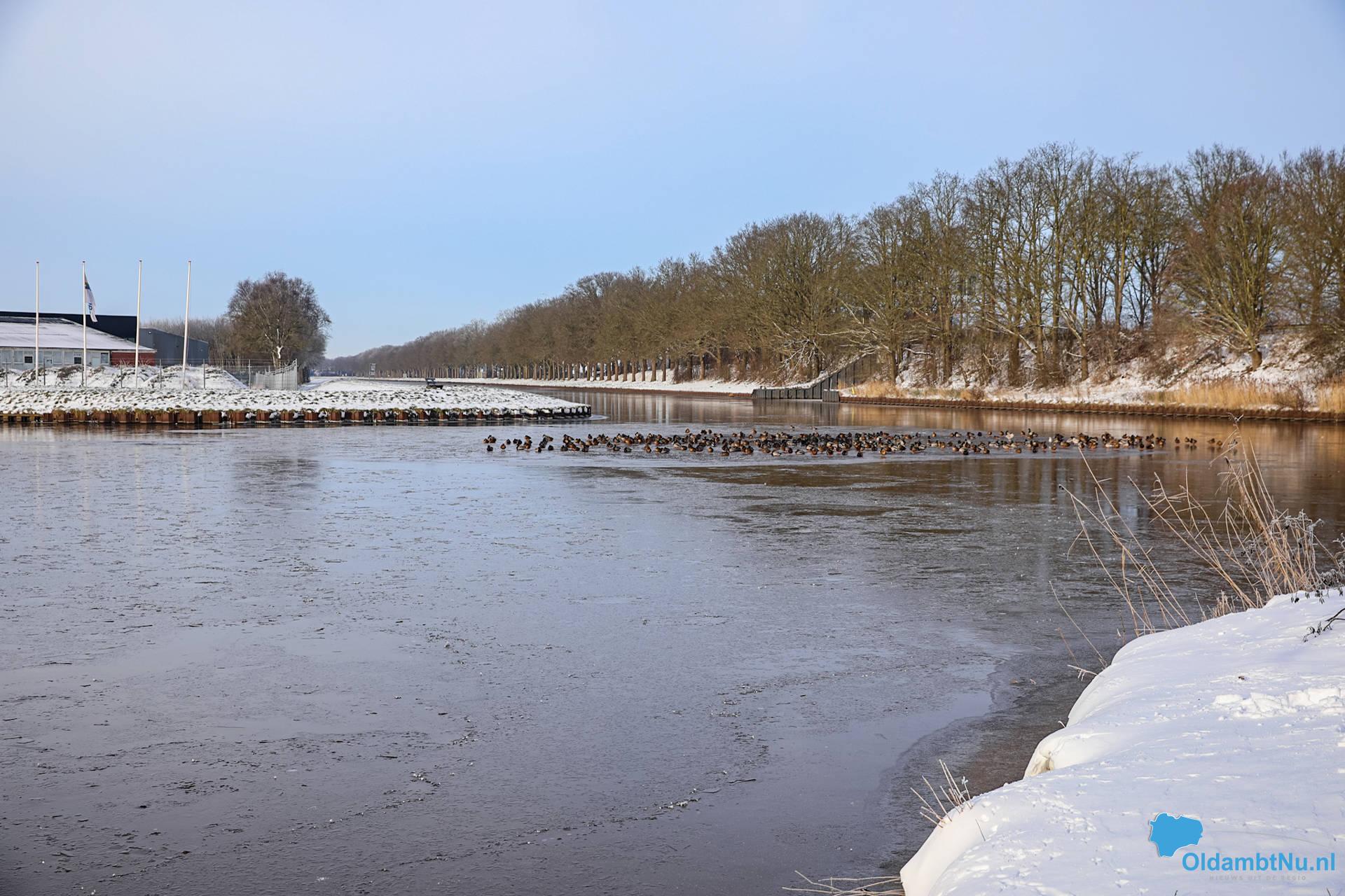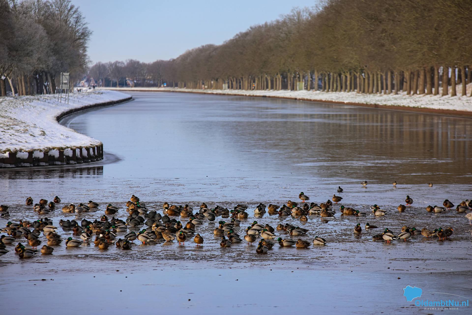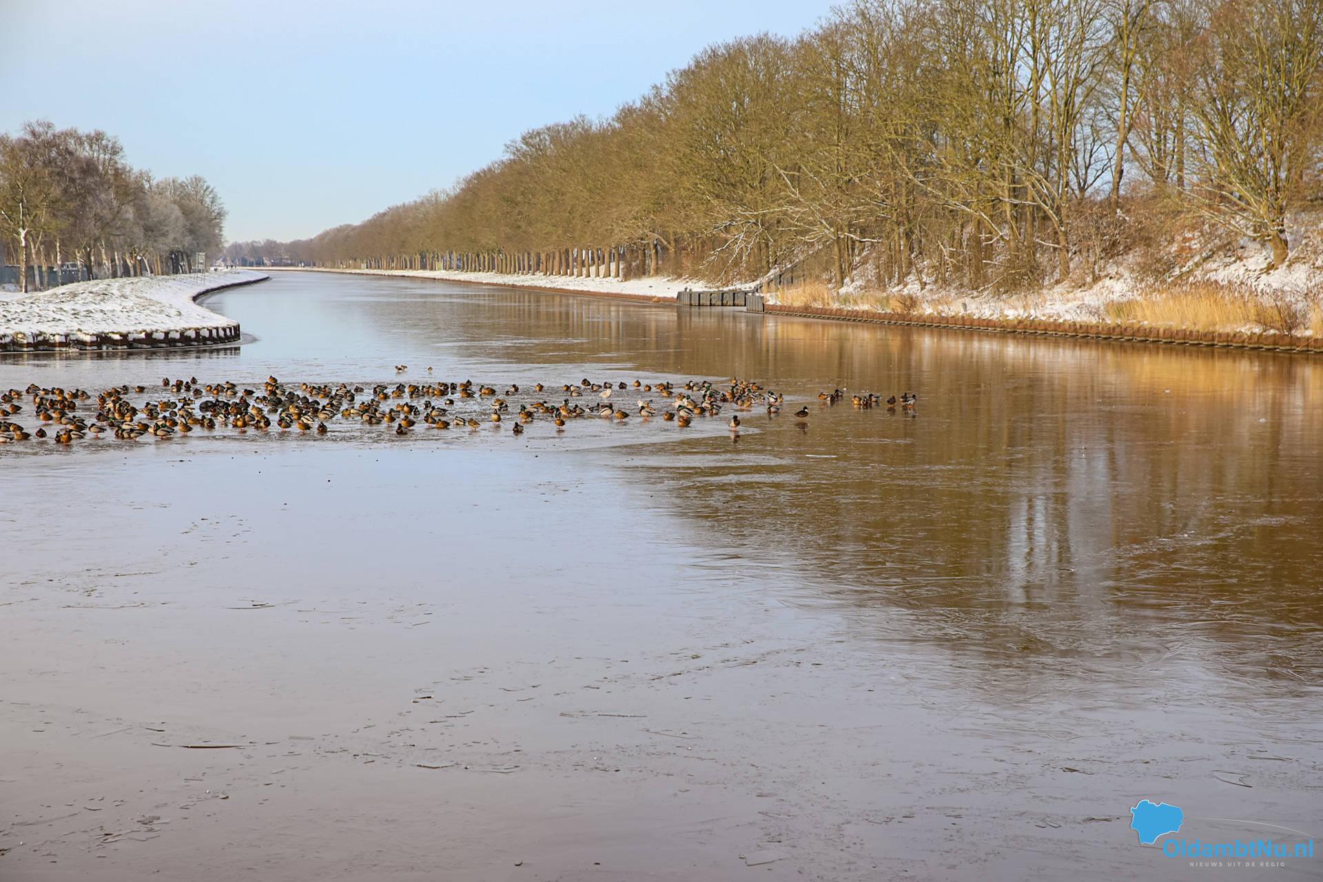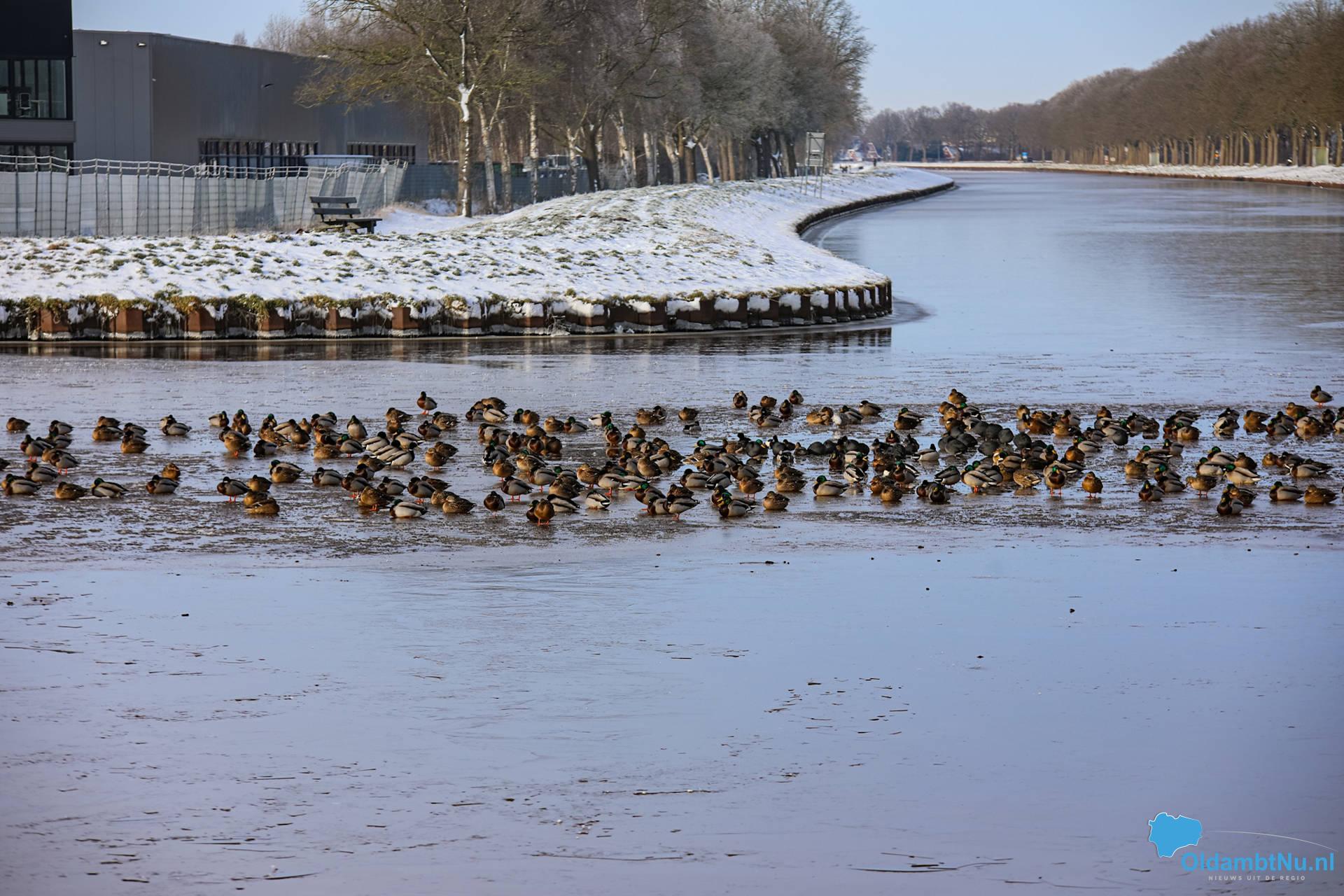 Winschoten – Het Winschoterdiep is door de aanhoudende vorst grotendeels dichtgevroren. Op het ijs zijn winterse taferelen te zien. Eenden hebben zich verzameld bij het laatste open wak en liggen dicht bij elkaar om warm te blijven.