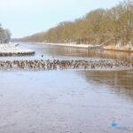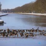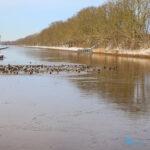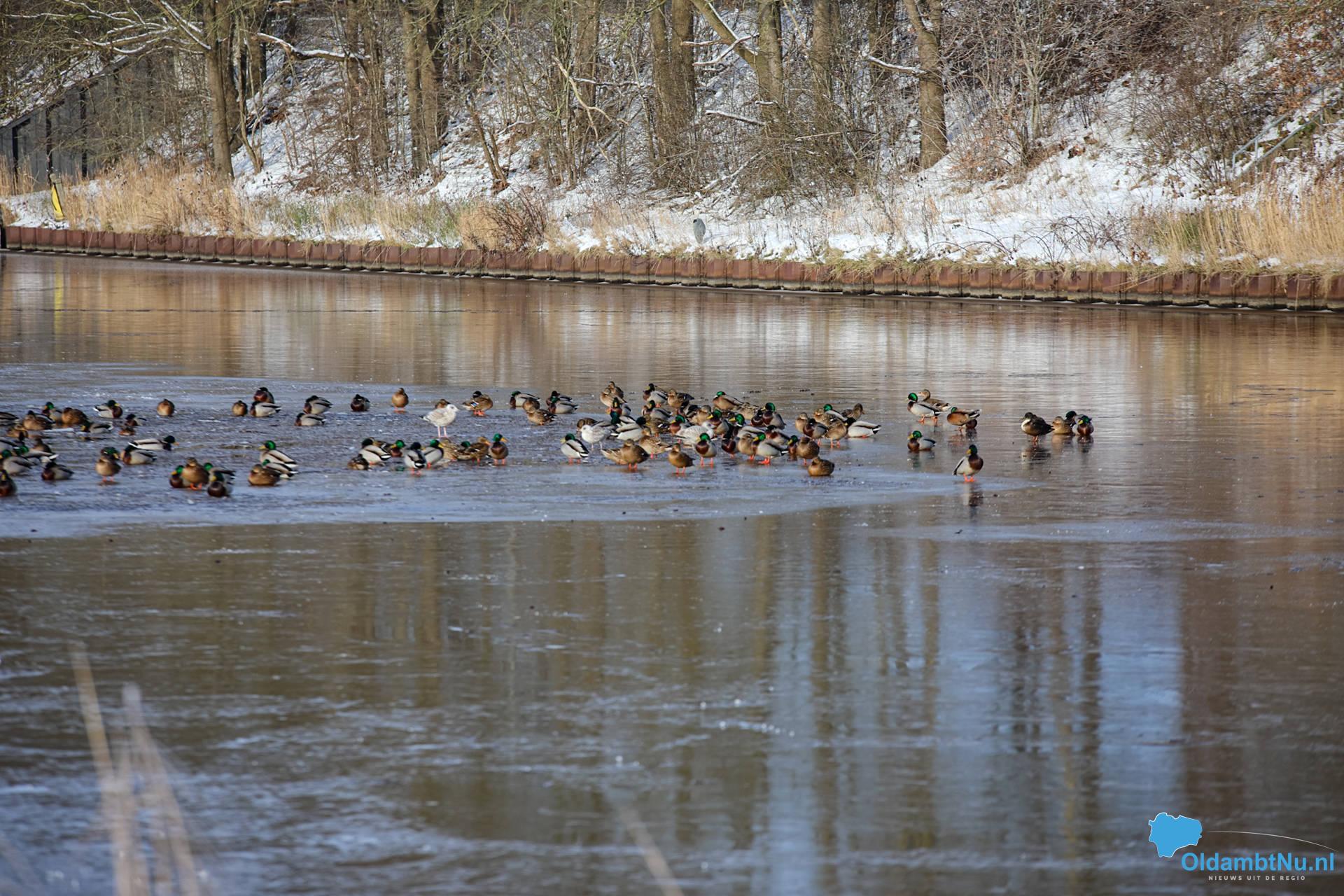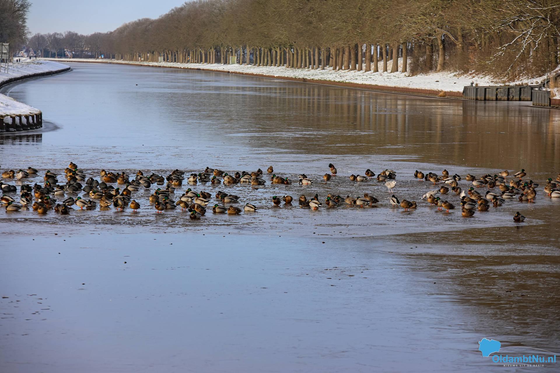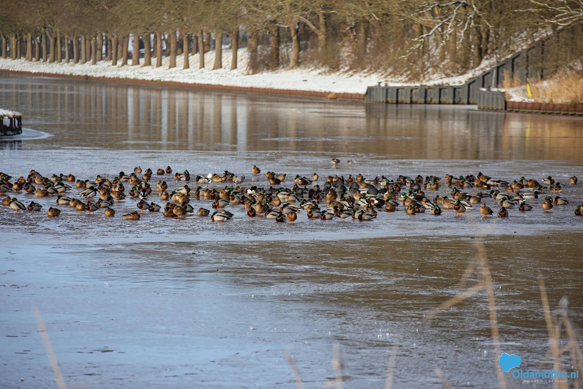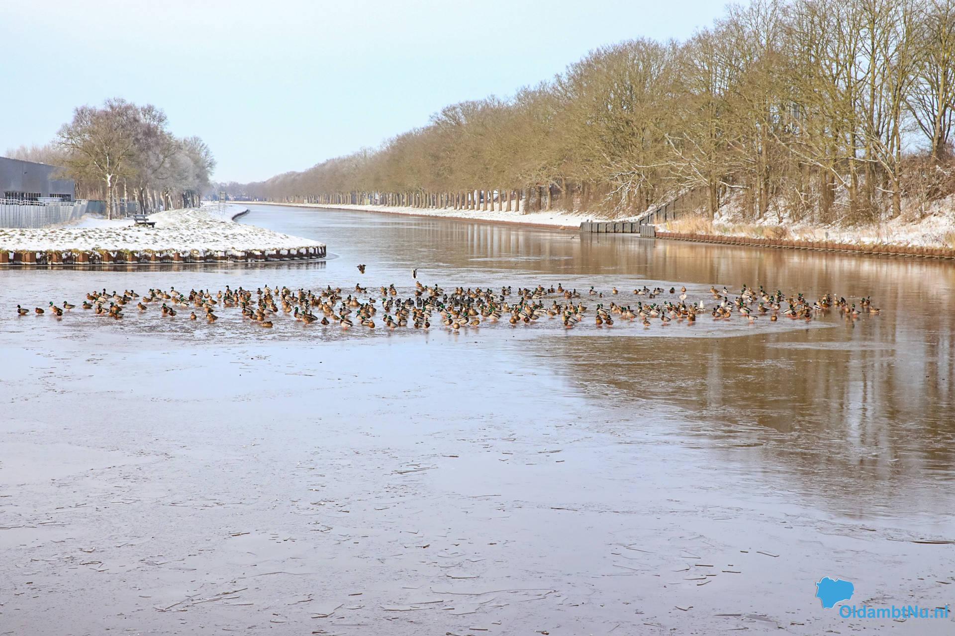 Winschoterdiep bij Scheemda dichtgevroren: eenden zoeken laatste wak