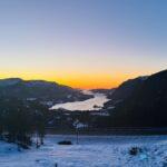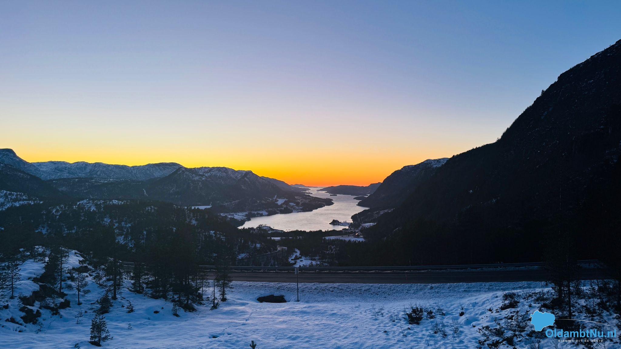 Aangezien wij ervan overtuigd waren dat een enorm mooi stuk van Noorwegen maandag door ons aanschouwd kon worden, stapten wij vanochtend vol enthousiasme in de auto. Na de auto gestart te hebben gaf de thermometer in de display – 20 graden aan. Wat weer een lekker temperatuurtje om in een warme auto te zitten gaven we elkaar aan. Daarom het kacheltje op standje max en de auto lekker opwarmen. Net toen de auto lekker op temperatuur begon te komen, zagen we een mooie zonsopkomst. Hierop besloten we om die vanuit de auto te gaan fotograferen. Dit omdat het – 20 graden was.