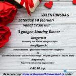 Een dag later, op zaterdag 14 februari (Valentijnsdag), kunnen gasten vanaf 17.00 uur aanschuiven voor een speciaal 3-gangen sharing dinner. Het diner bestaat uit een proeverij van kleine voorgerechten, gevolgd door een keuze uit vlees of vis als hoofdgerecht. Afsluiten gebeurt met een proeverij van nagerechten. De prijs bedraagt €42,50 per persoon. Reserveren is gewenst en kan via de website van het restaurant onder vermelding van ‘Sharing dinner’.