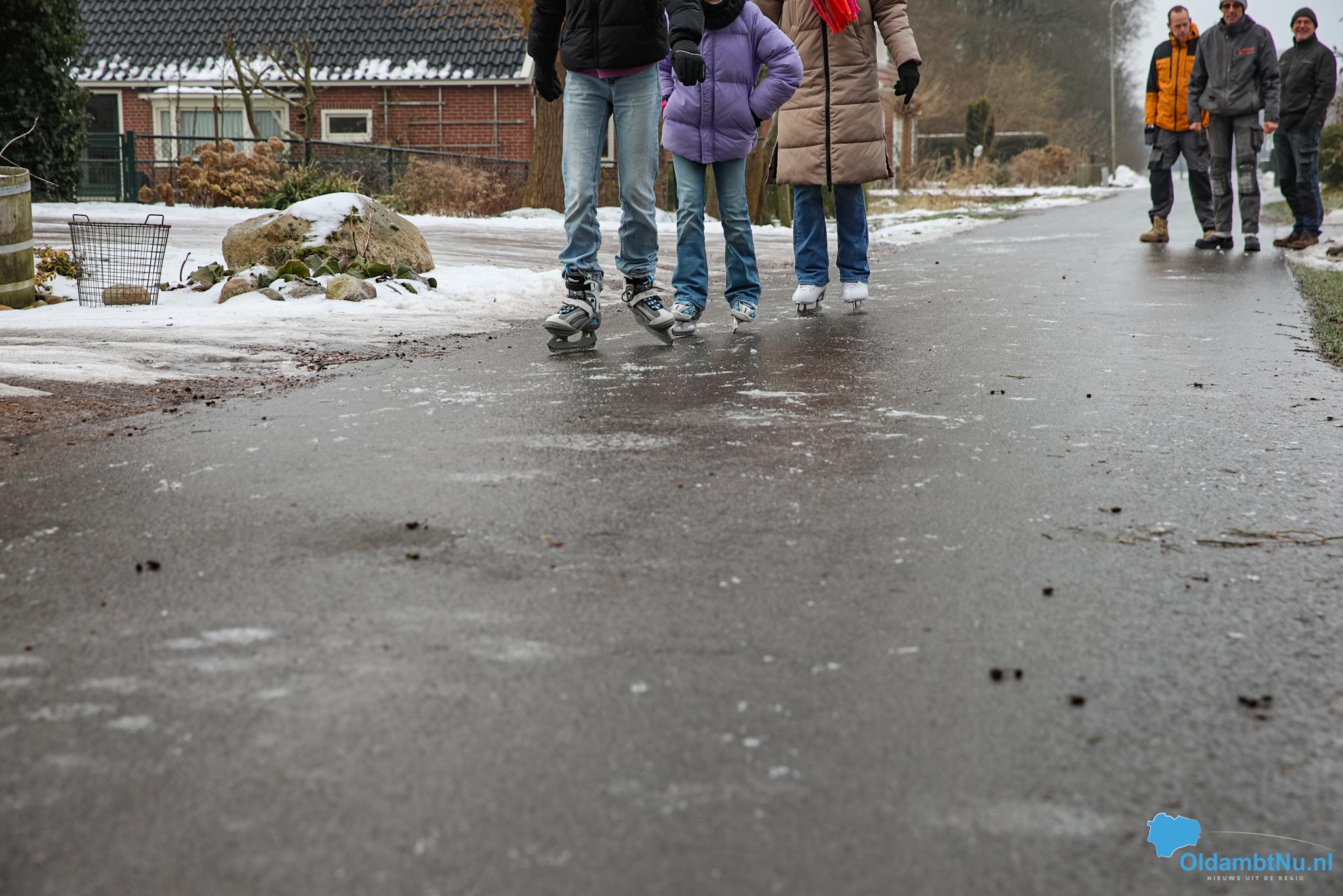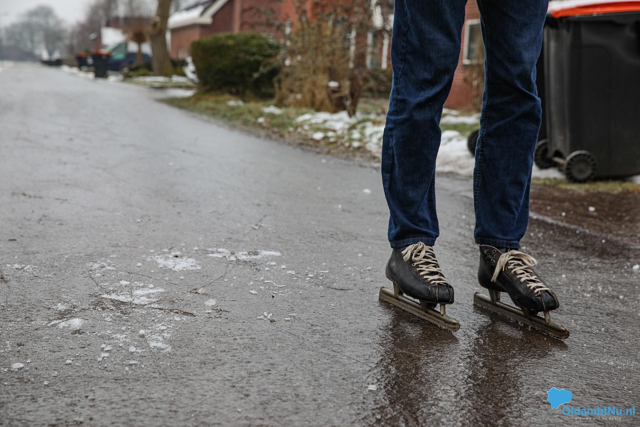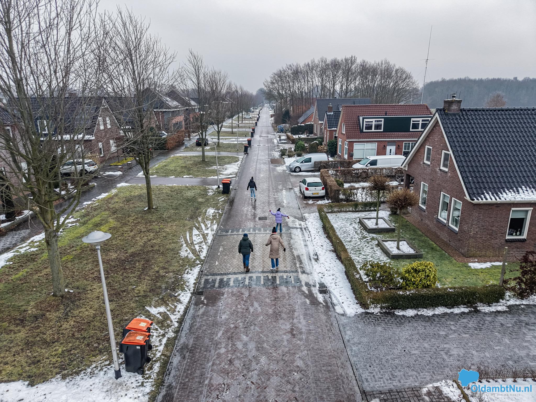 Scheemda – In Scheemda hebben jongeren woensdag gebruikgemaakt van het ijs op straat. Met de schaatsen onder de voeten werden de eerste rondjes gemaakt, midden in de woonwijken.