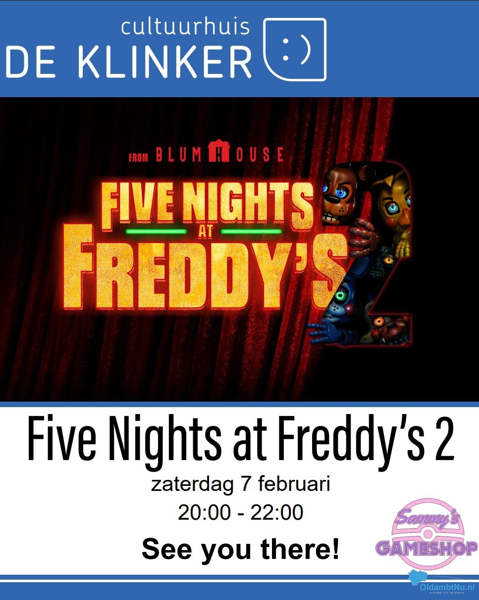 Winschoten – Op vrijdag 7 februari wordt in Cultuurhuis De Klinker in Winschoten de film Five Nights at Freddy’s 2 vertoond. De film begint om 20:00 uur. Bezoekers zijn al vanaf 19:00 uur welkom om vooraf een bezoek te brengen aan een speciaal standje van Sammy’s Gameshop.