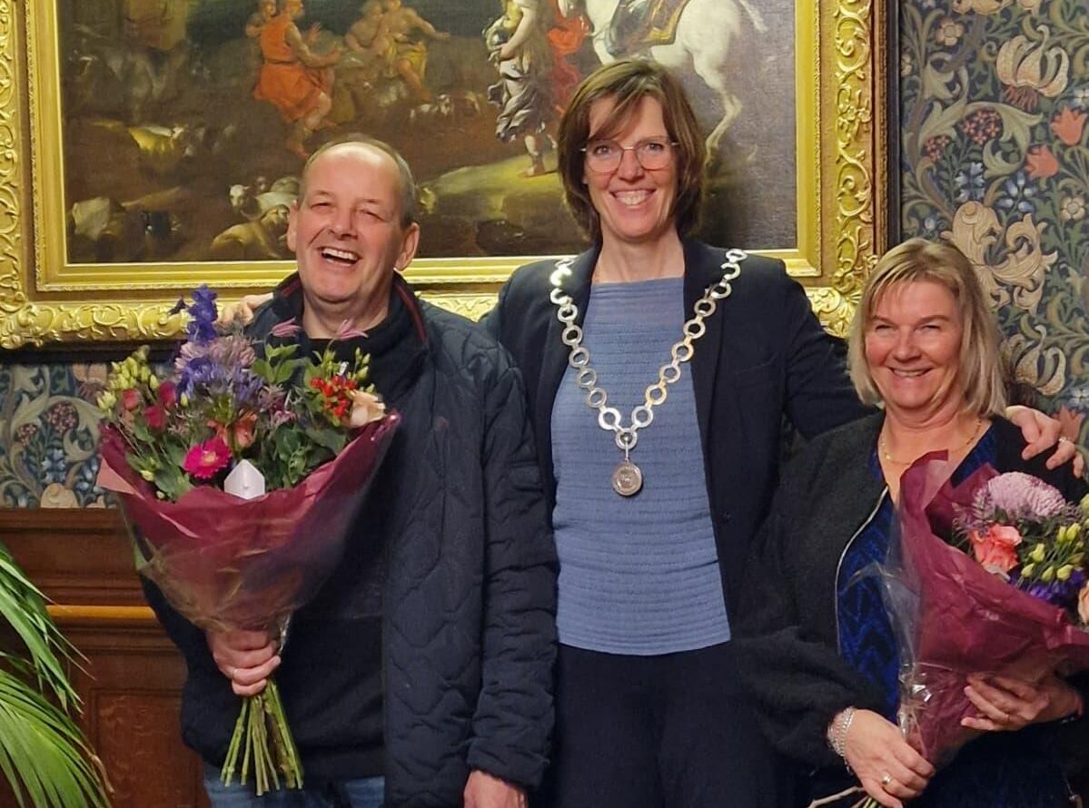 De beide inwoners konden rekenen op lovende woorden van de burgemeester. En het bleef niet alleen bij woorden. Met een grote bos bloemen en een mooie cadeaubon verlieten Fenneke en Gerrit het gemeentehuis.