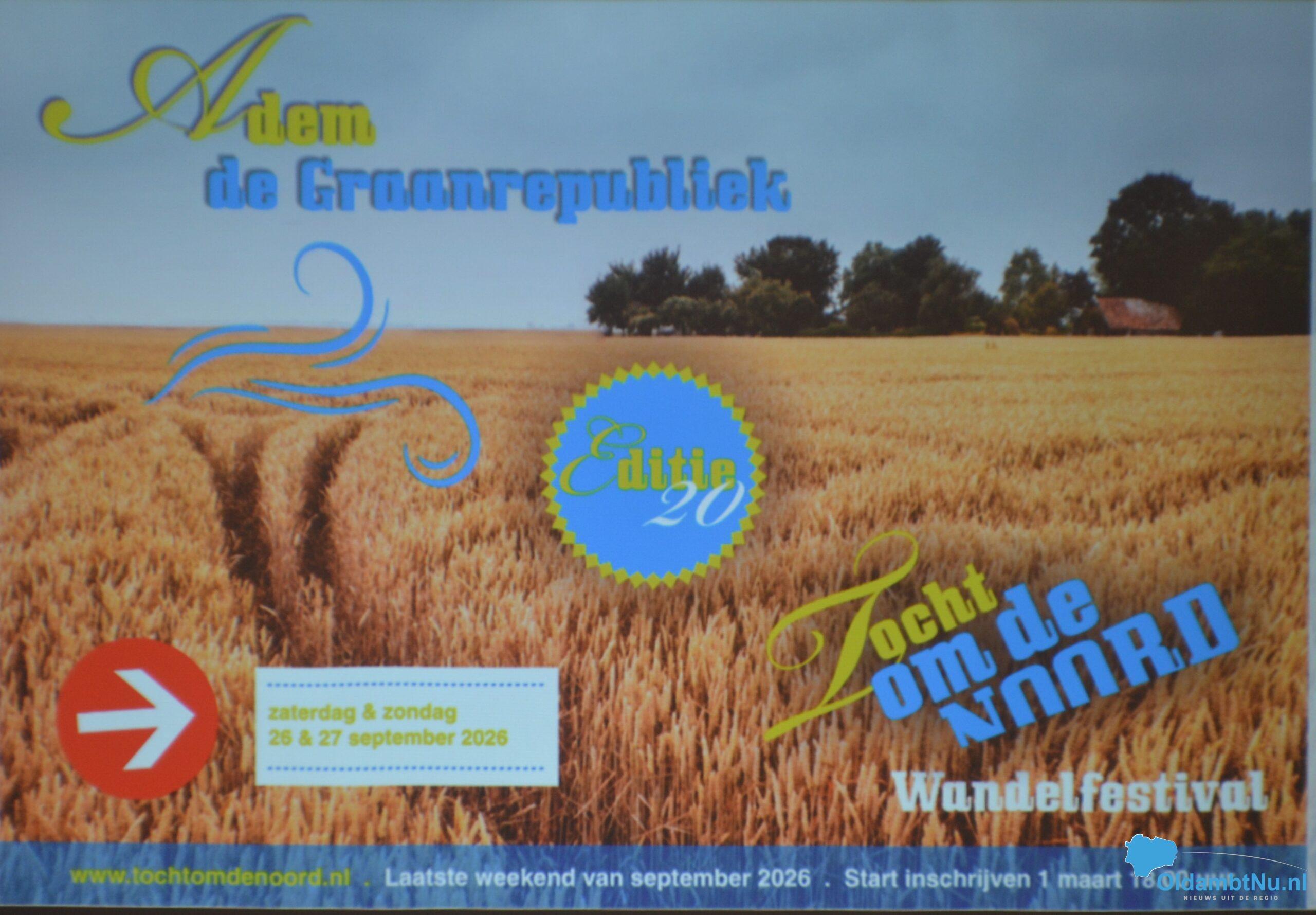 Winschoten – Vanaf 1 maart kan men zich weer inschrijven voor de ‘Tocht om de Noord’ editie 2026 en dit jaar start deze wandeltocht in het Oldambt. Het wordt een bijzondere editie, eentje met een ‘gouden rand’ zoals ze het zelf zeggen. Het wordt namelijk de 20e keer dat de Tocht om de Noord wordt georganiseerd. De route voor dit jaar loopt door eindeloze akkers die in de zomer veranderen in een goudgele zee, met de geur van tarwe als trouwe metgezel.