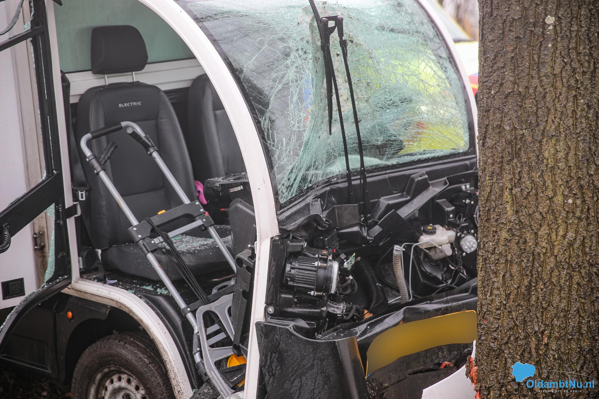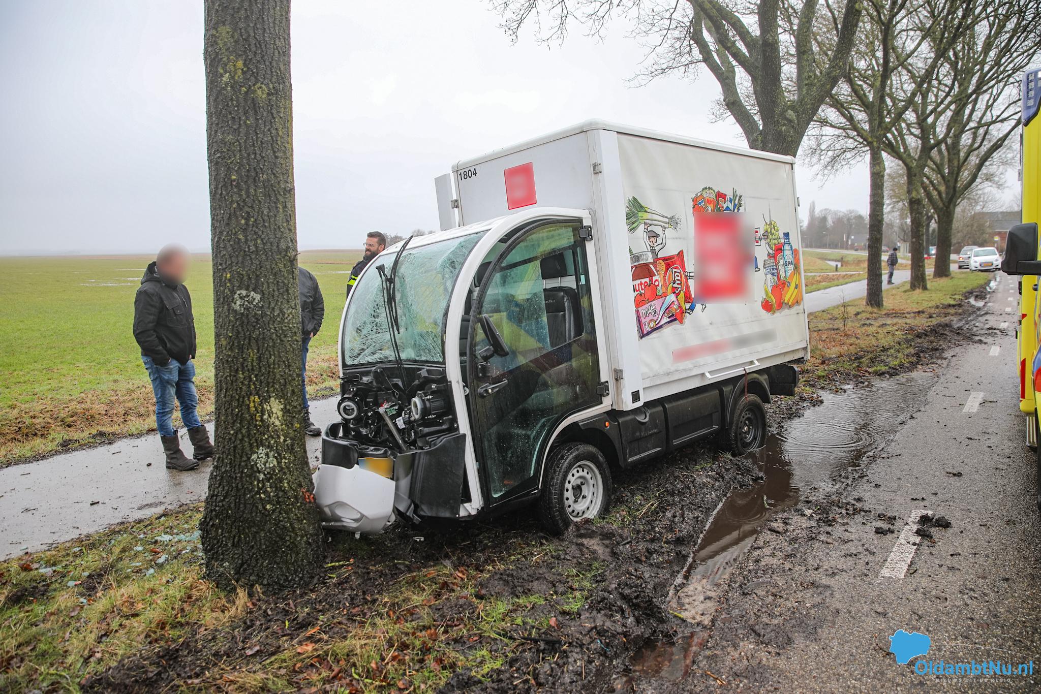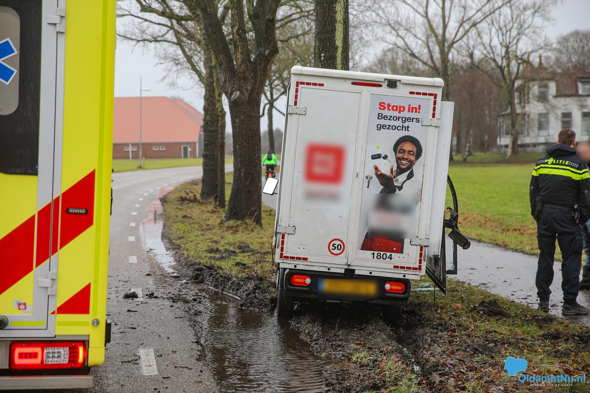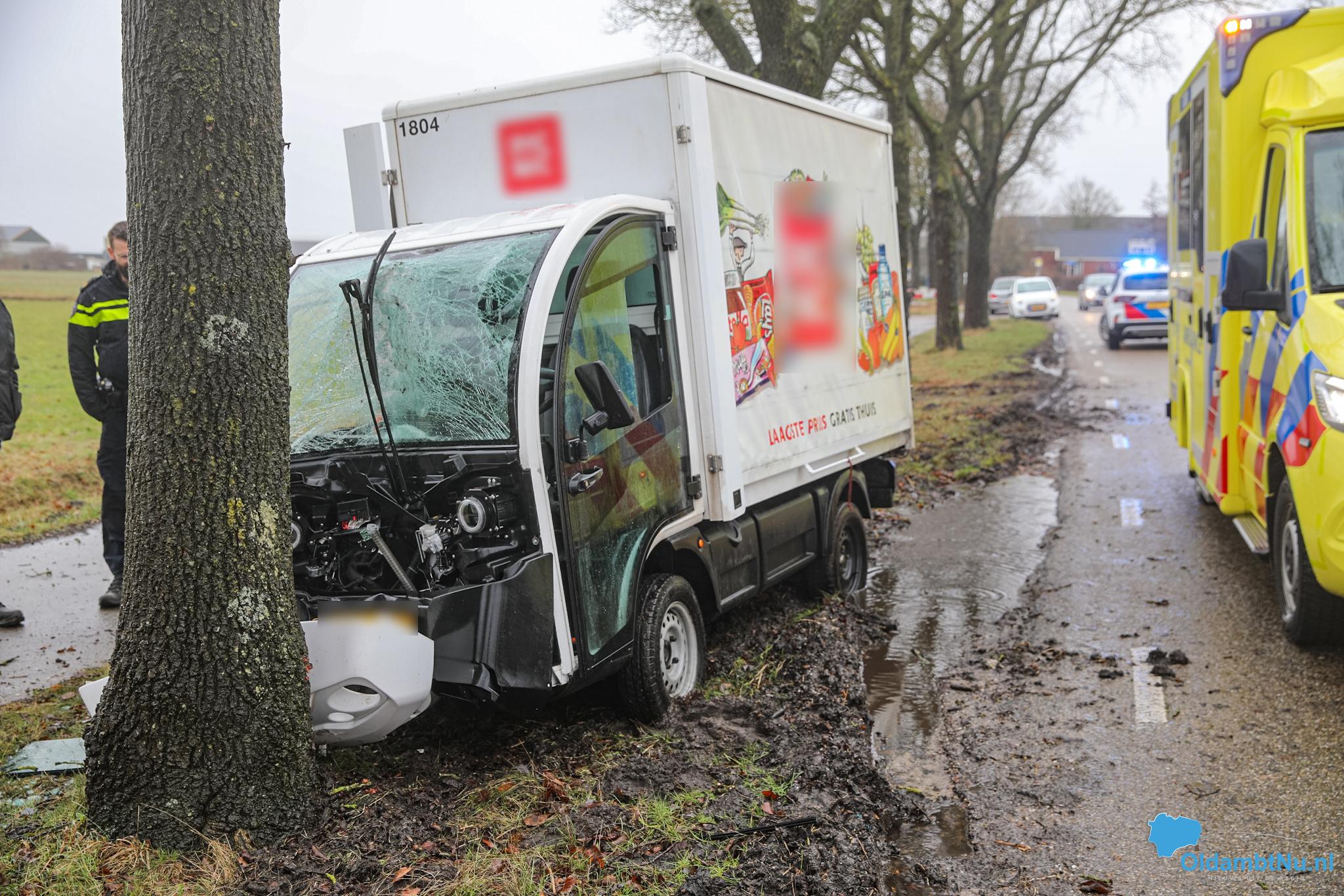 Een boodschappenbezorgauto is door nog onbekende oorzaak tegen een boom aangereden. Politie en ambulance kwamen met spoed ter plaatse om hulp te verlenen.