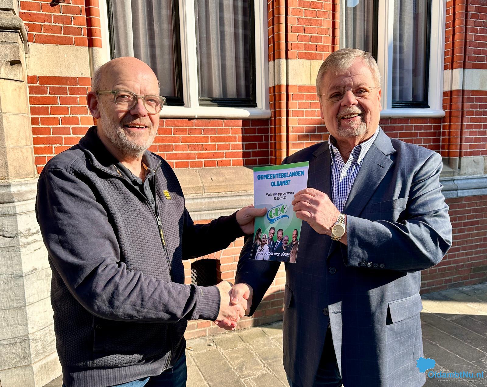 Voorzitter Chris de Raaf heeft het verkiezingsprogramma 2026–2030 van Gemeentebelangen Oldambt overhandigd aan lijsttrekker Ger Klein. In het programma kiest de partij voor praktische oplossingen voor de problemen waar inwoners dagelijks mee te maken hebben, zonder zich te laten leiden door links-rechts tegenstellingen.