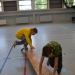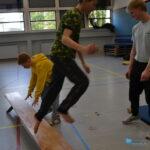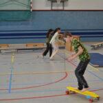 “Wij hadden ook BMX’en meegenomen, maar die mogen wij in de sporthal niet gebruiken, want die laten te veel strepen op de vloer achter. Urban sports is een verzamelnaam voor uiteenlopende sport- en beweegactiviteiten die hun oorsprong vinden op straat en worden beoefend in de stedelijke, openbare ruimte”, zegt Rolf.