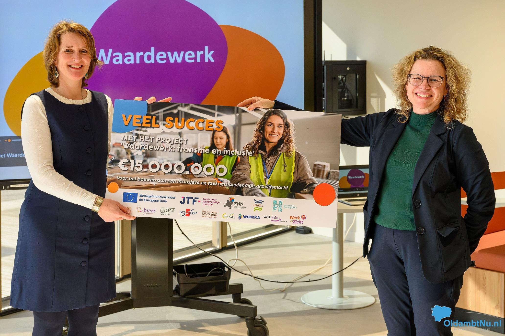 Groningen – Op woensdag 4 maart was de feestelijke startbijeenkomst van het project Waardewerk, een project dat zich richt op langdurig werkzoekenden met een afstand tot de arbeidsmarkt. Tijdens de startbijeenkomst reikte Marjan Dol, directeur van het Samenwerkingsverband Noord-Nederland (SNN), symbolisch een cheque uit aan de deelnemende gemeenten en sociaal ontwikkelbedrijven. Ze ontvingen 15 miljoen euro subsidie uit het Europese Just Transition Fund (JTF) voor hun project.