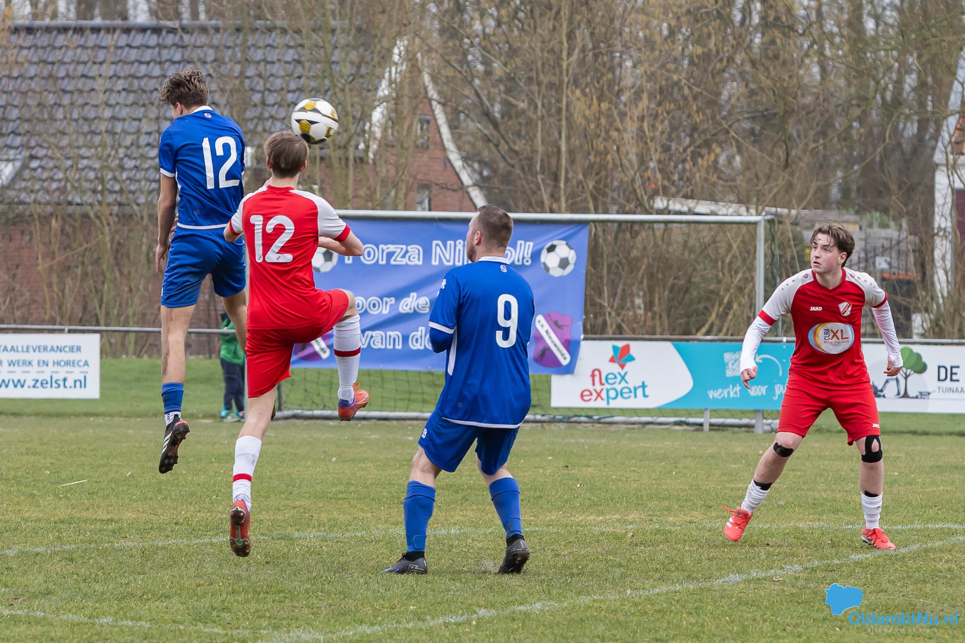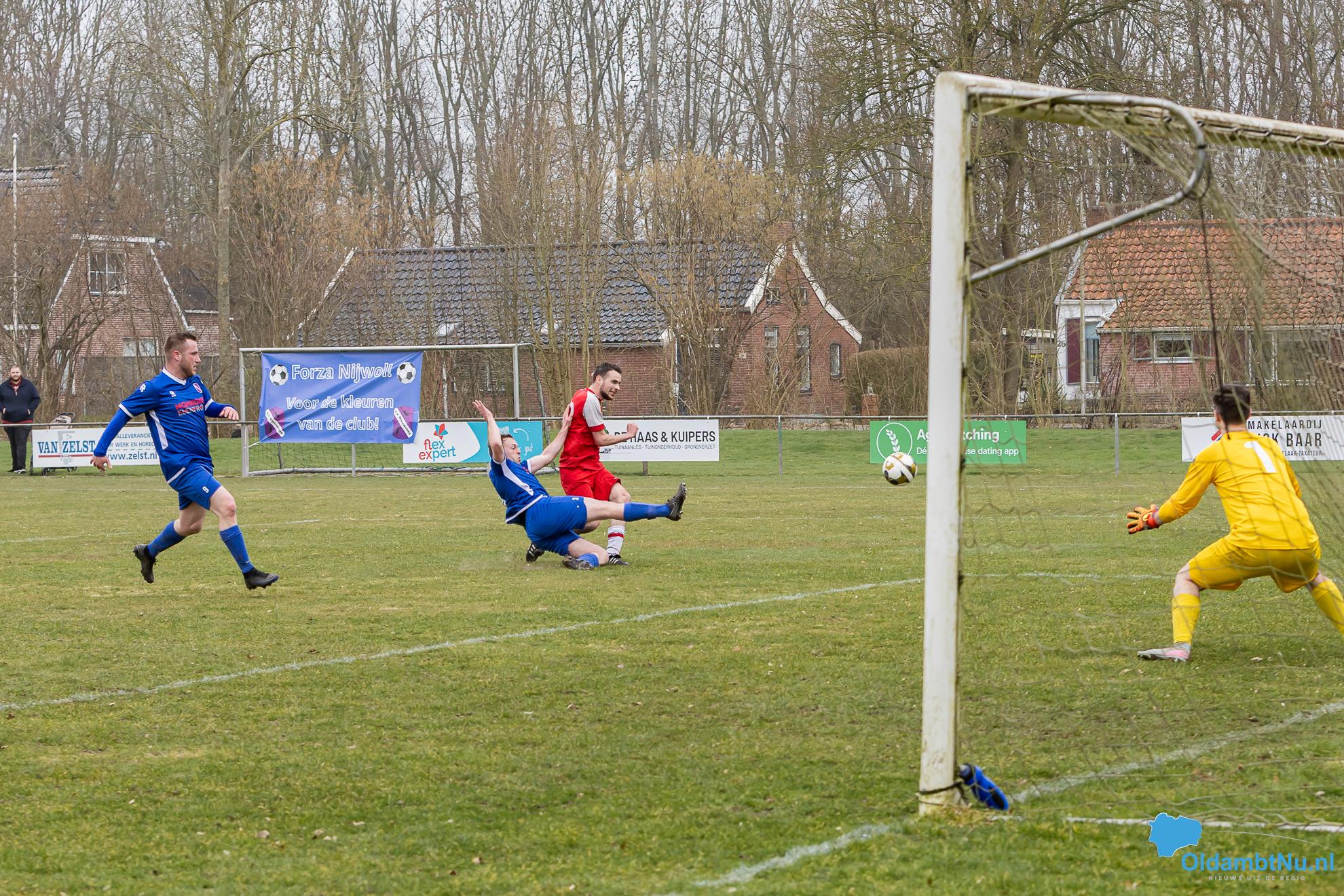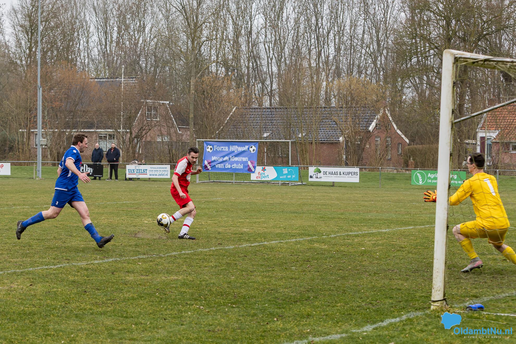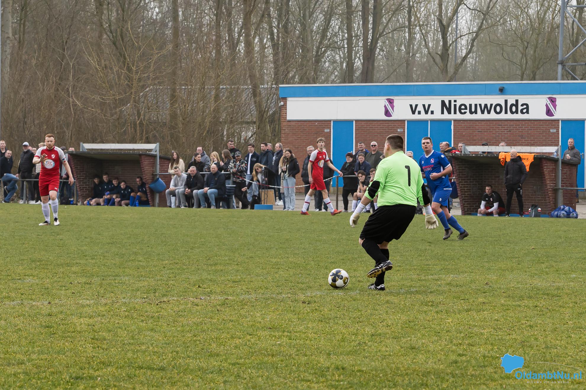 Nieuwolda begon wat stroef aan de wedstrijd, maar kreeg wel de eerste grote mogelijkheid. Martijn Ganzeveld kwam bij een hoge bal boven iedereen uit en kopte richting doel, maar zag zijn inzet op de lat belanden.
