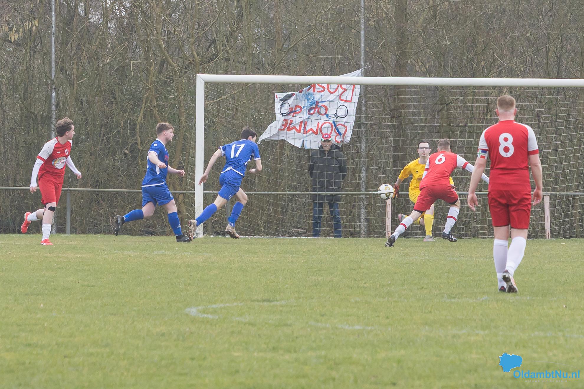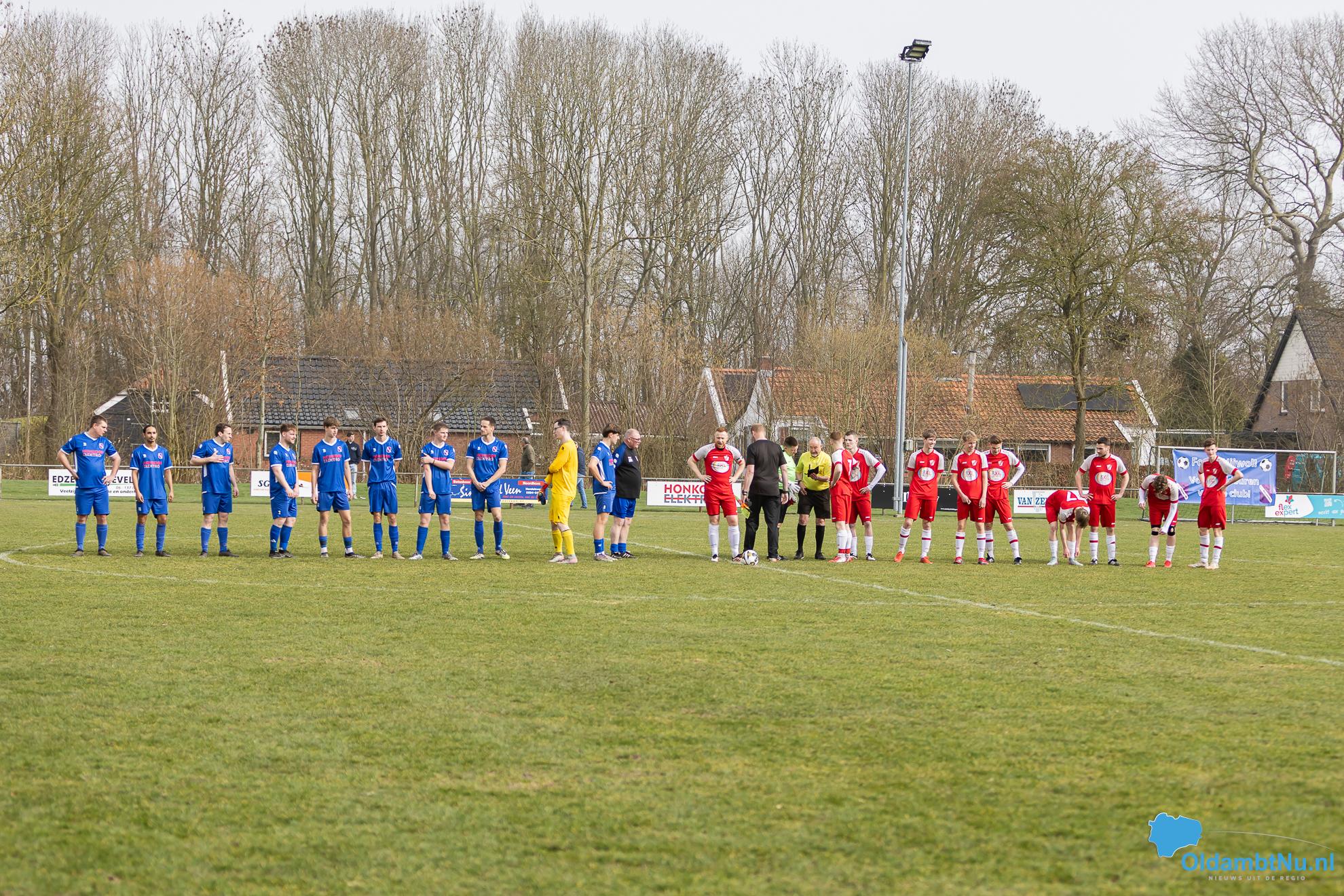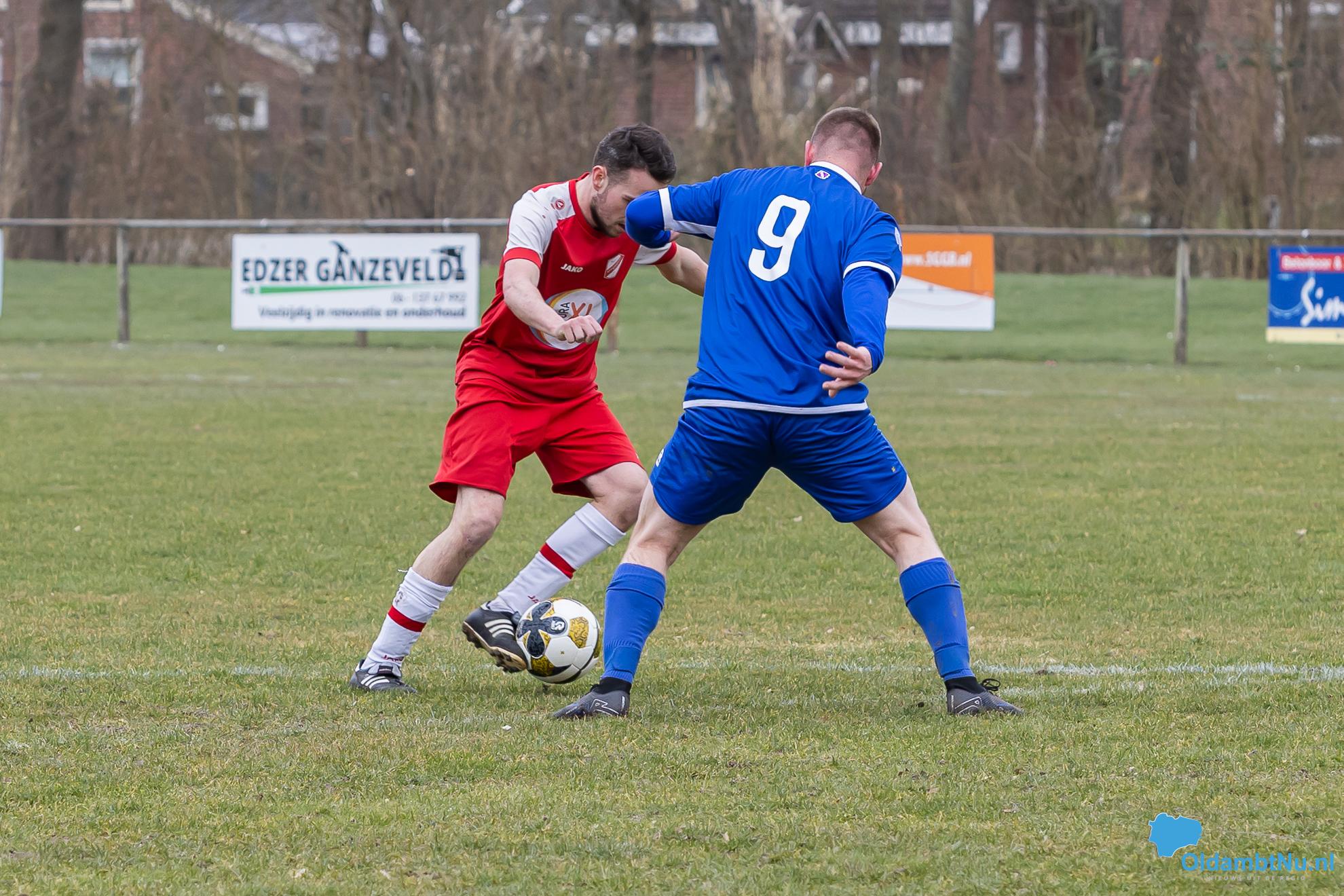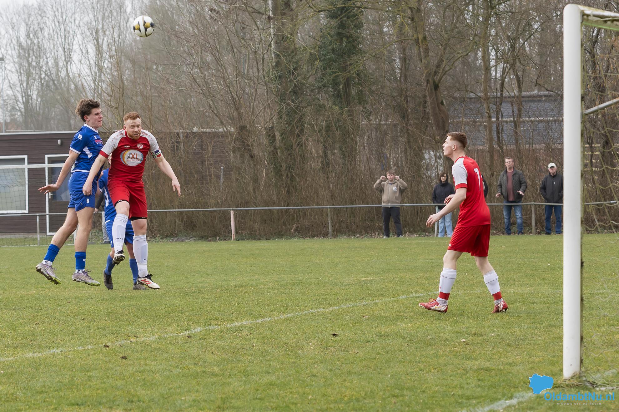 Nieuwolda begon wat stroef aan de wedstrijd, maar kreeg wel de eerste grote mogelijkheid. Martijn Ganzeveld kwam bij een hoge bal boven iedereen uit en kopte richting doel, maar zag zijn inzet op de lat belanden.