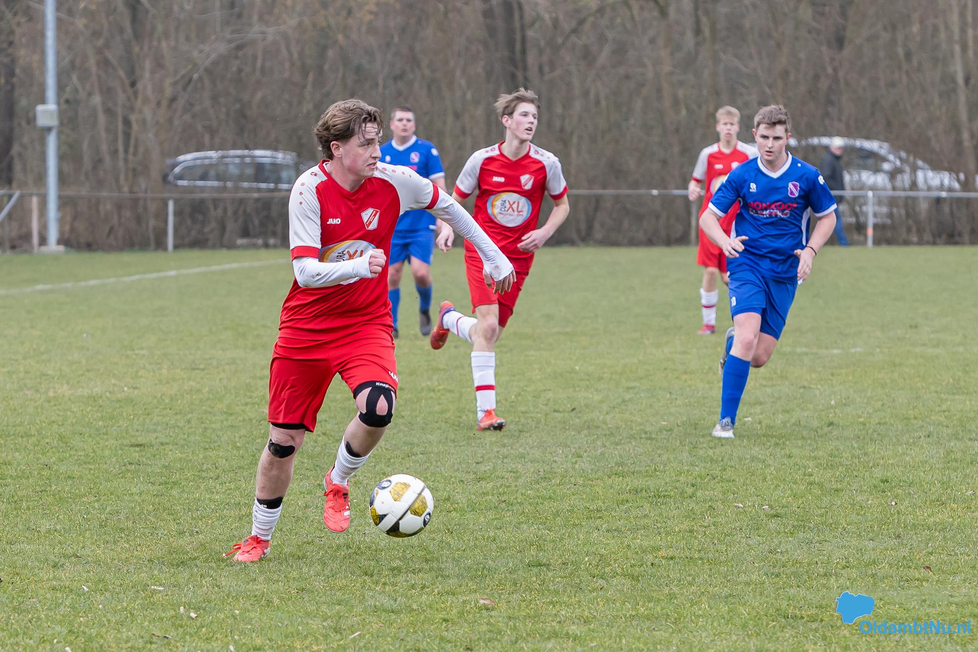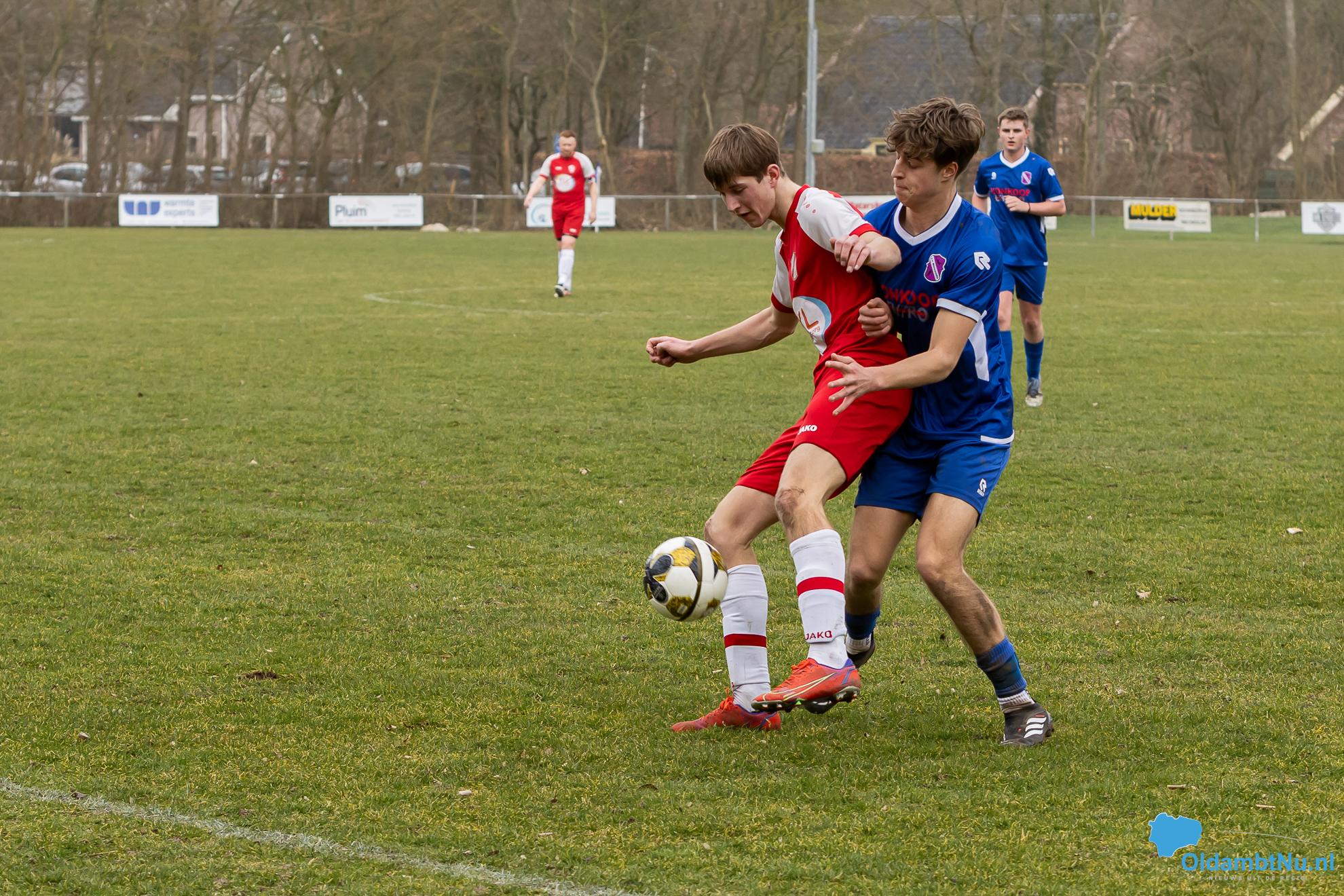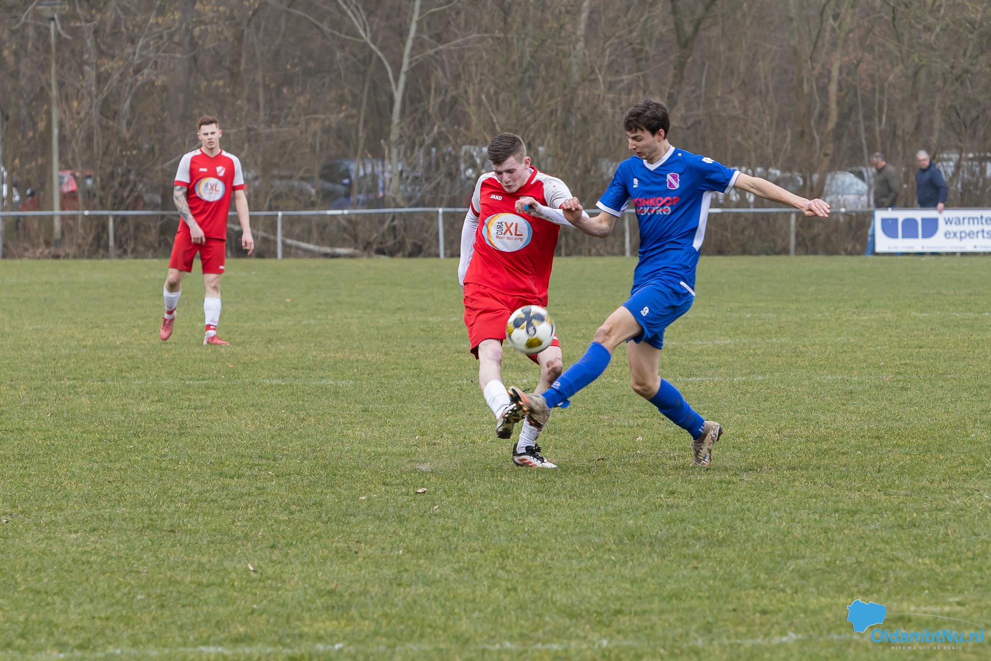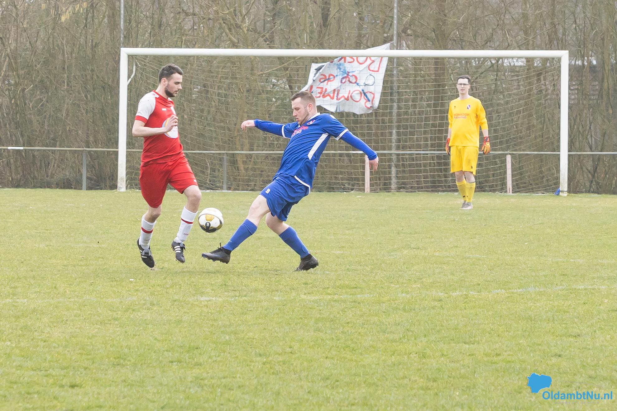 Nieuwolda begon wat stroef aan de wedstrijd, maar kreeg wel de eerste grote mogelijkheid. Martijn Ganzeveld kwam bij een hoge bal boven iedereen uit en kopte richting doel, maar zag zijn inzet op de lat belanden.