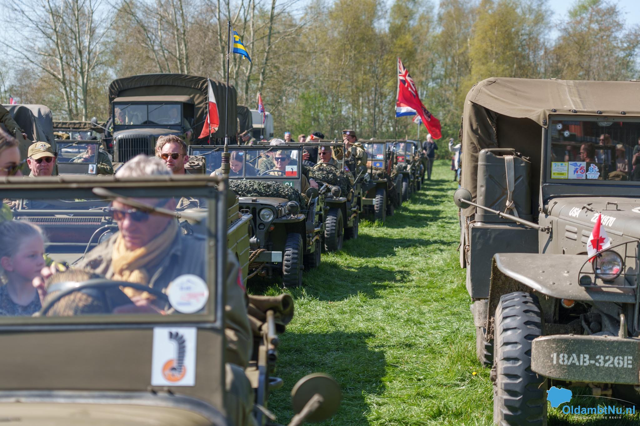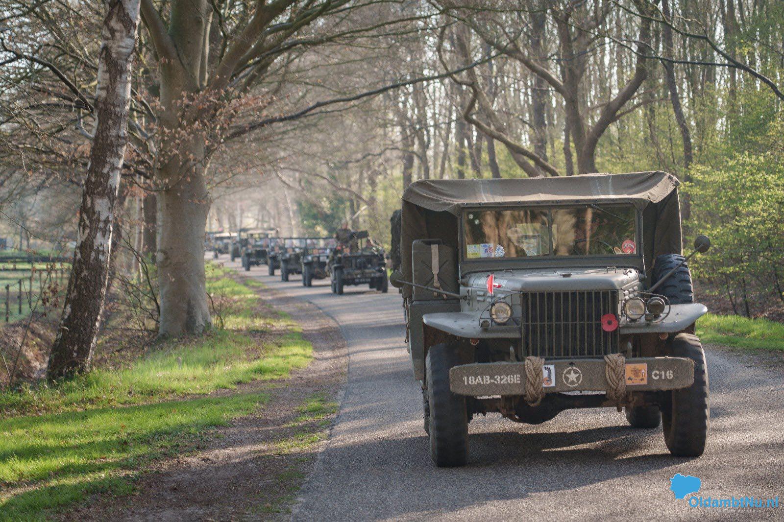 militair materieel uit de Tweede Wereldoorlog. De colonne bestaat uit authentieke jeeps, GMCtrucks en Harley-Davidson Liberators — stuk voor stuk rijdend erfgoed dat met grote zorg wordt onderhouden.