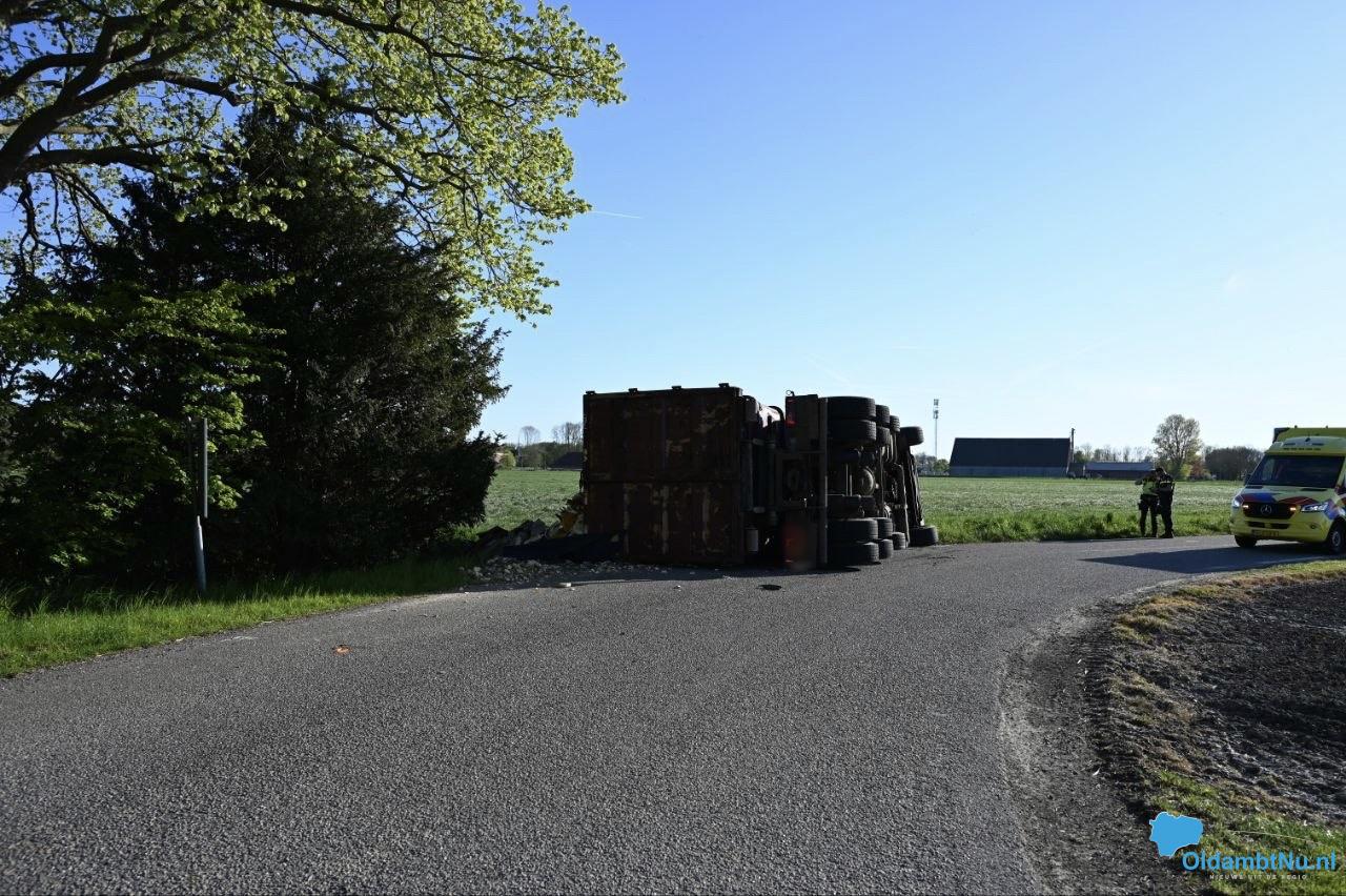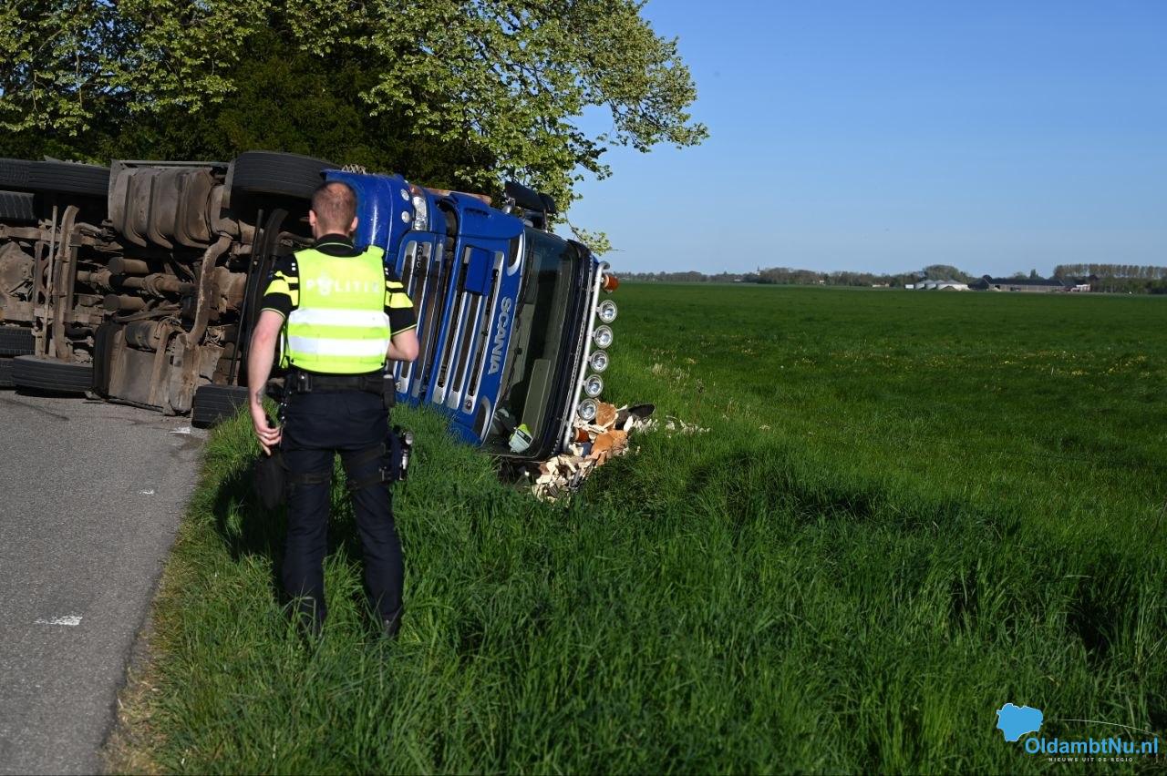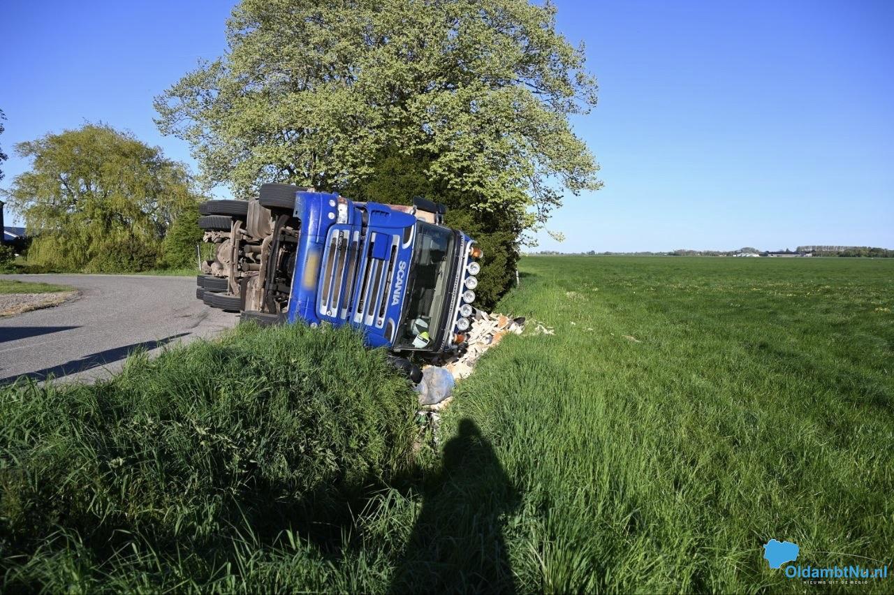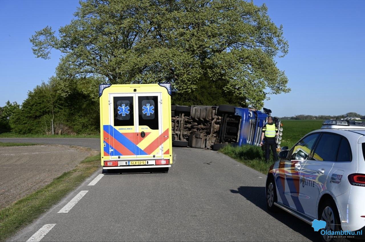Oostwold – Op de Polderweg in Oostwold is een vrachtwagen gekanteld en op zijn kant langs de weg tot stilstand gekomen. De vrachtwagenchauffeur raakte bij het incident lichtgewond. Hij is na controle door het ambulancepersoneel overgebracht naar het ziekenhuis voor controle.